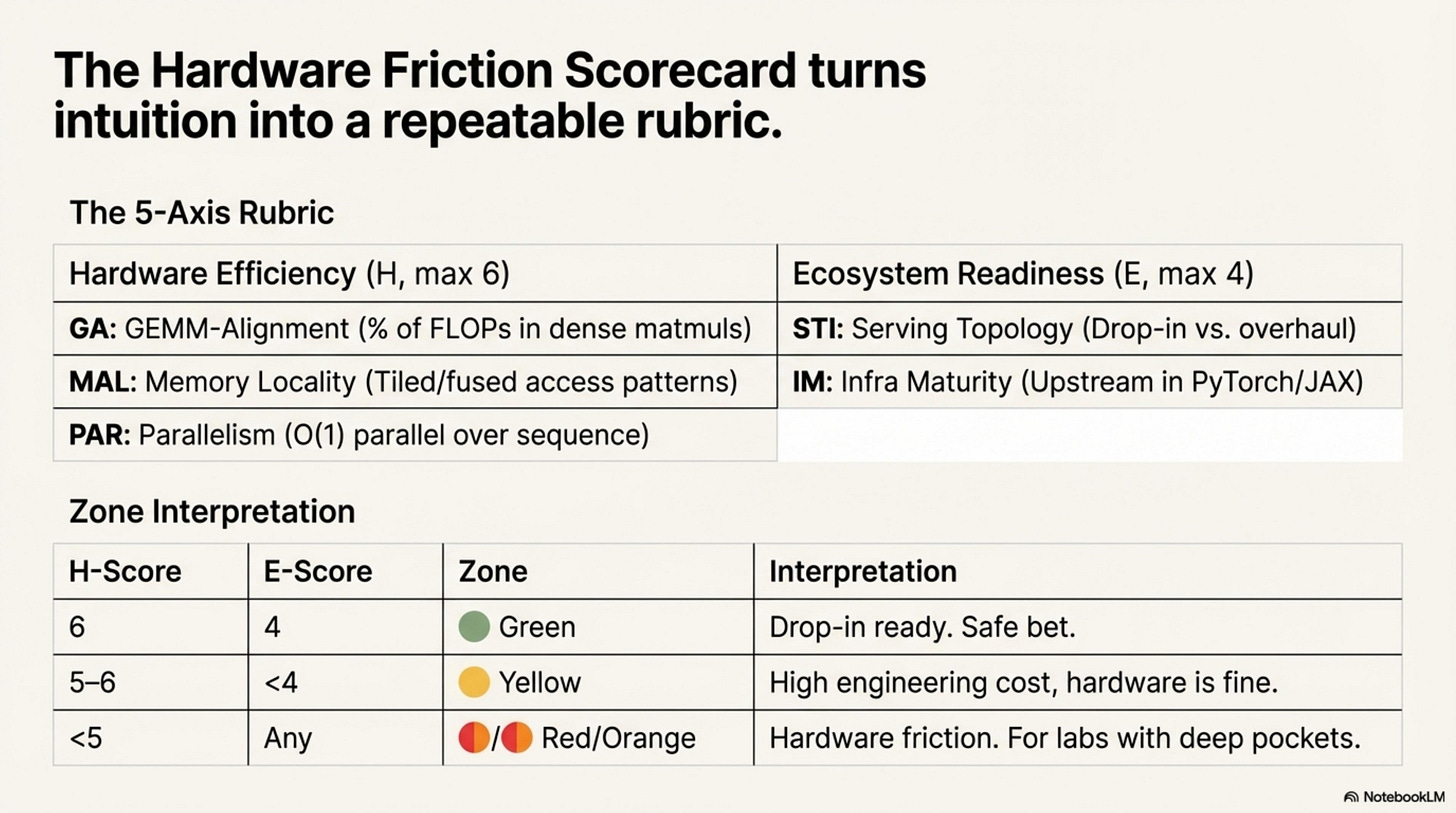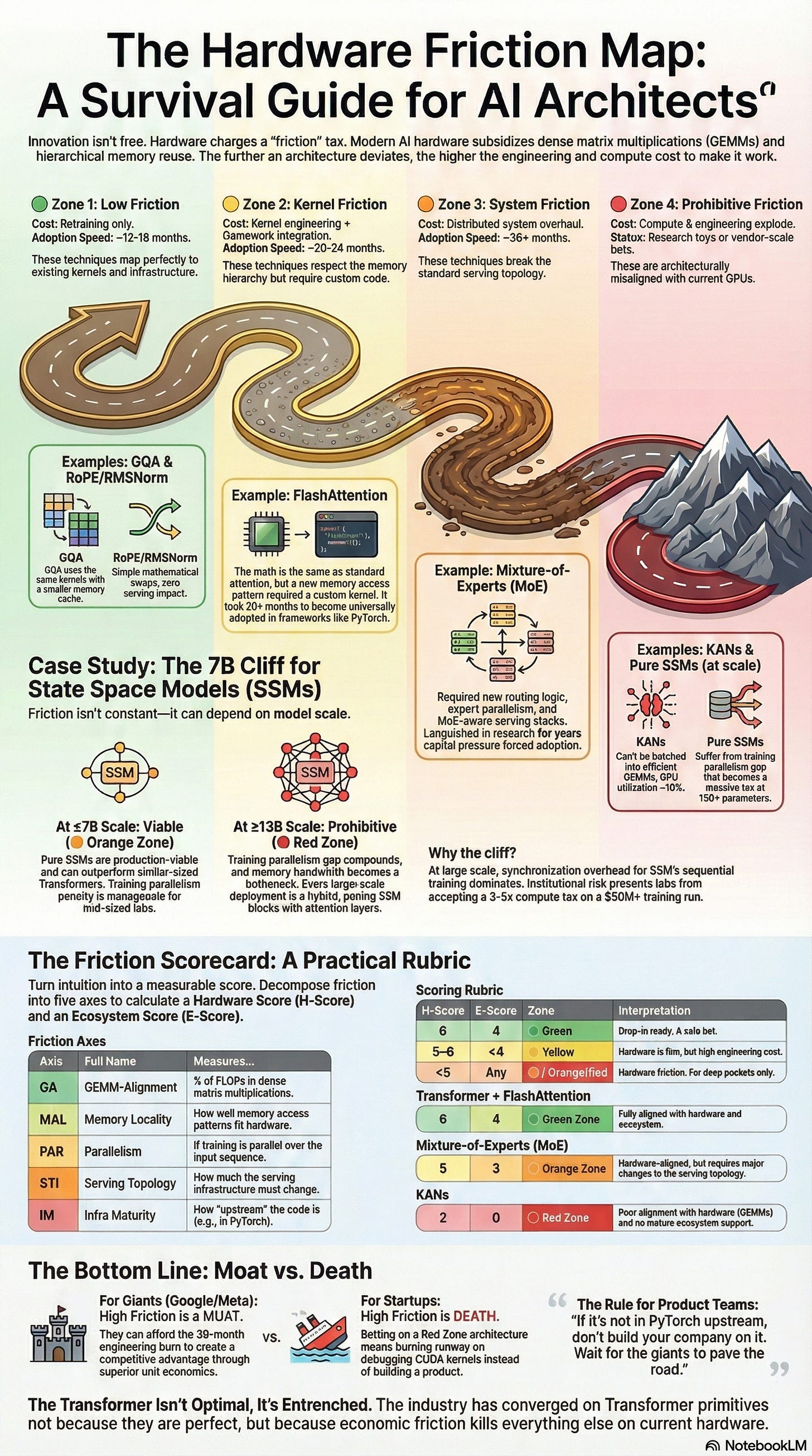 - The Hardware Friction Map gives a practitioner checklist (kernel shape, memory, parallelism, serving topology, infra maturity) to score new papers and predict adoption risk—especially for startups that don’t control their hardware stack.