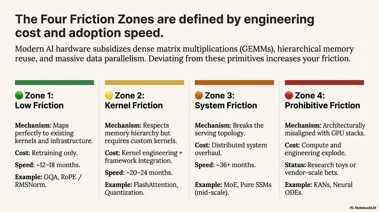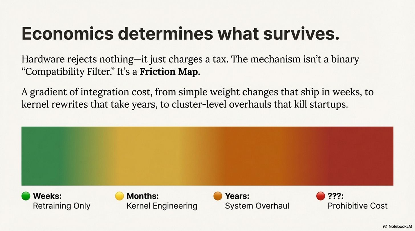 Hardware rejects nothing—it just charges a tax. You can run KANs. You can run pure Neural ODEs. They just cost 100× more per token than a dense matrix multiplication. The mechanism isn’t a binary “Compatibility Filter.” It’s a Friction Map—a gradient of integration cost from weight-only changes that ship in weeks, to kernel rewrites that take years, to cluster-level overhauls that kill startups.