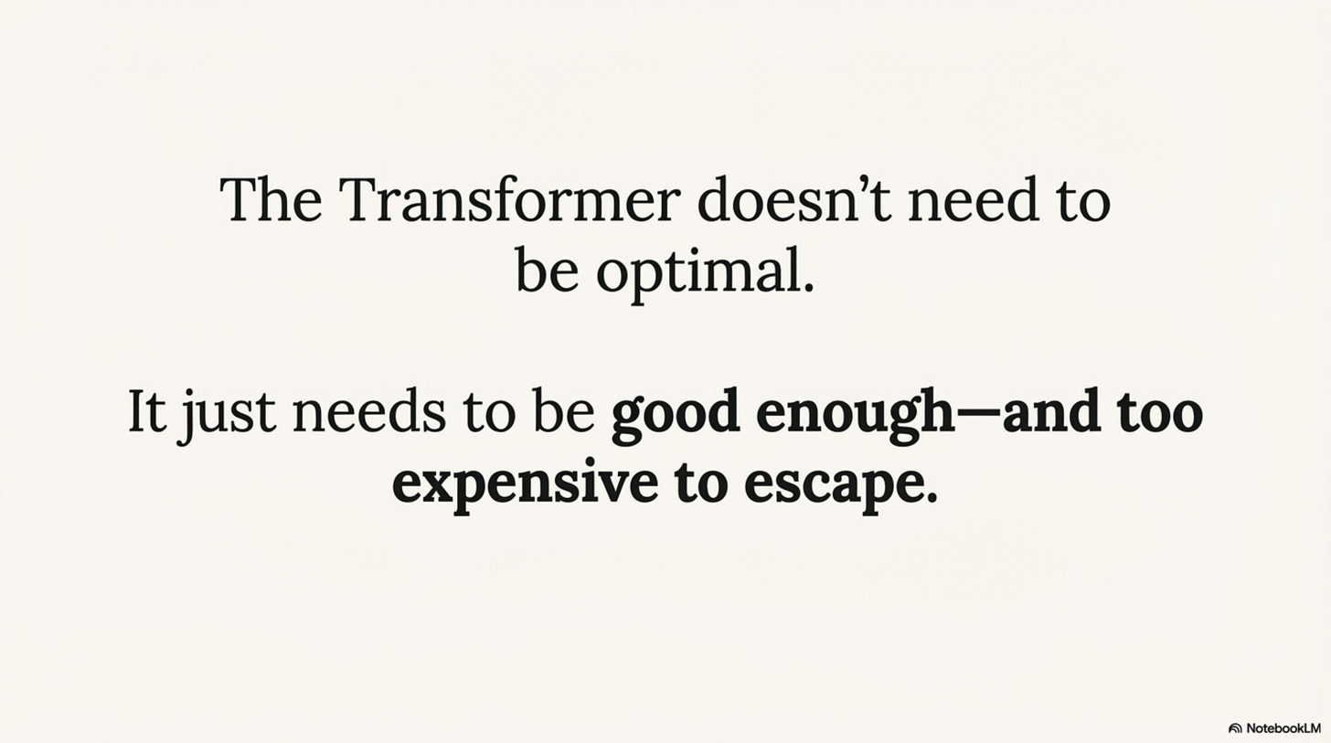 The Transformer doesn’t need to be optimal. It just needs to be good enough—and too expensive to escape.