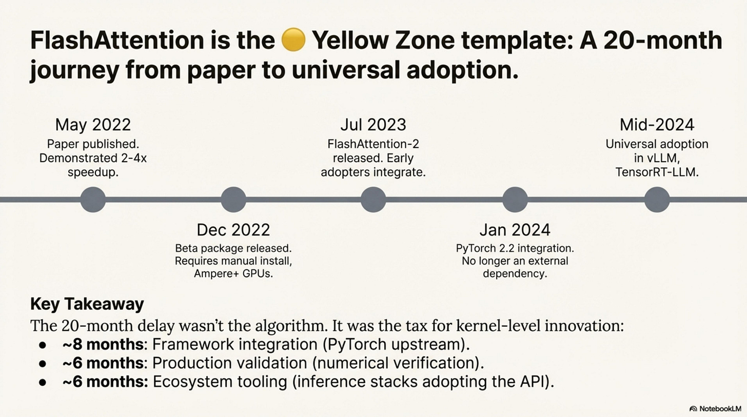 FlashAttention is the canonical example of kernel friction—technically beneficial from Day 1, but taking 20+ months to reach universal adoption: