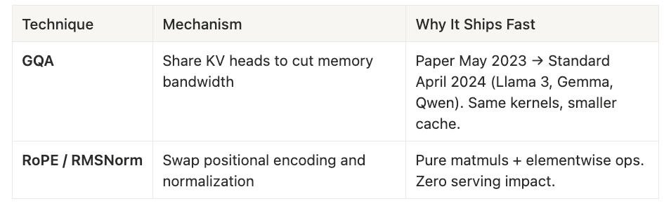 Similarly, RoPE and RMSNorm are pure weight-space changes: swapping positional encoding or normalization layers requires only retraining, since both map to standard matmuls and elementwise operations. They have zero serving impact and ship as fast as labs can complete a training run.