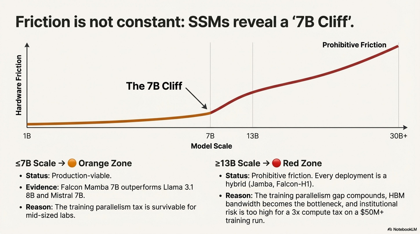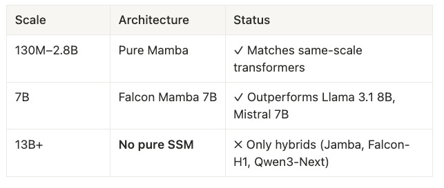 The practical heuristic: If you’re building at ≤7B, pure SSM is a legitimate option (Orange zone). If you’re building at ≥13B, plan for a hybrid or accept Red-zone friction.