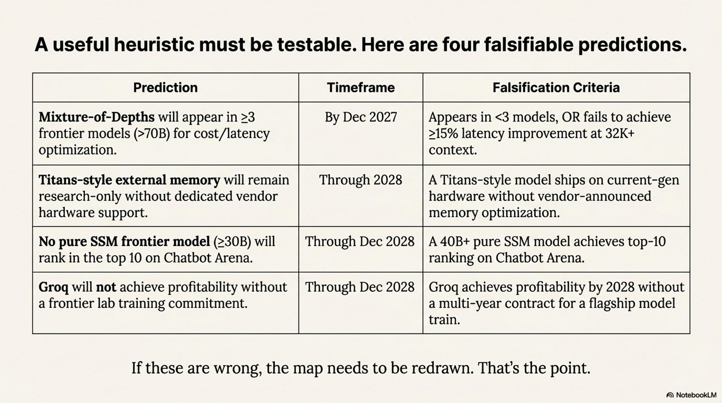 - The essay ends with explicit, falsifiable bets about Mixture‑of‑Depths, Titans‑style external memory, and pure SSM frontier models, so the framework can be tested—not just admired.