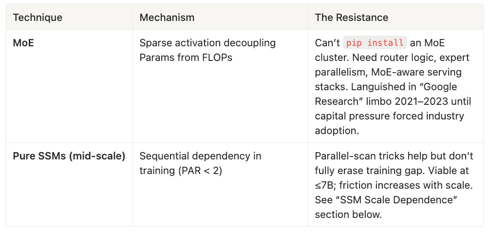 Mixture-of-Experts is the template here. Sparse activation decouples parameter count from FLOPs, but you cannot pip install an MoE cluster. Router logic, expert parallelism, and MoE-aware serving stacks must be built from scratch. MoE languished in “Google Research limbo” from 2021 to 2023, ignored by industry until capital pressure to scale beyond dense models became unbearable.