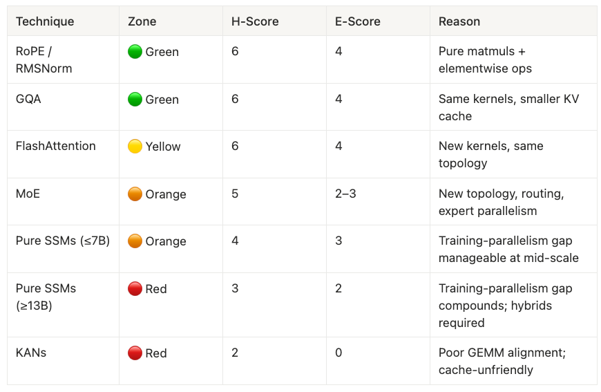 - Techniques that stay close to GEMMs + SRAM‑friendly memory access and require no new serving topology (RoPE, RMSNorm, GQA, FlashAttention) diffuse quickly; ideas that fight this (pure SSMs at frontier scale, KANs, naive MoE at long context) become research curiosities or require massive capital.