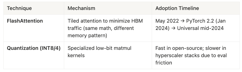 Quantization (INT8/4 matmuls) follows a similar pattern: custom kernels are straightforward to write, but integrating them into production stacks—especially hyperscaler environments that require extensive numerical validation—adds another year to the timeline