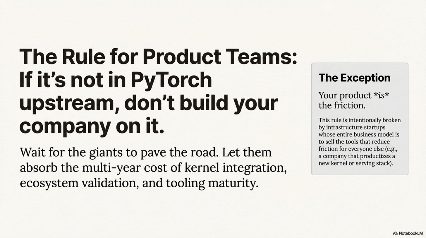 The Rule (for product teams): If it’s not in PyTorch upstream, don’t build your company on it. Wait for the giants to pave the road.
