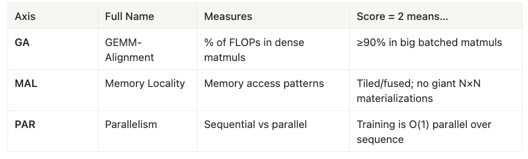 The H-Score is the sum of GA, MAL, and PAR—how well the architecture fits GPU primitives, scored 0 to 6.