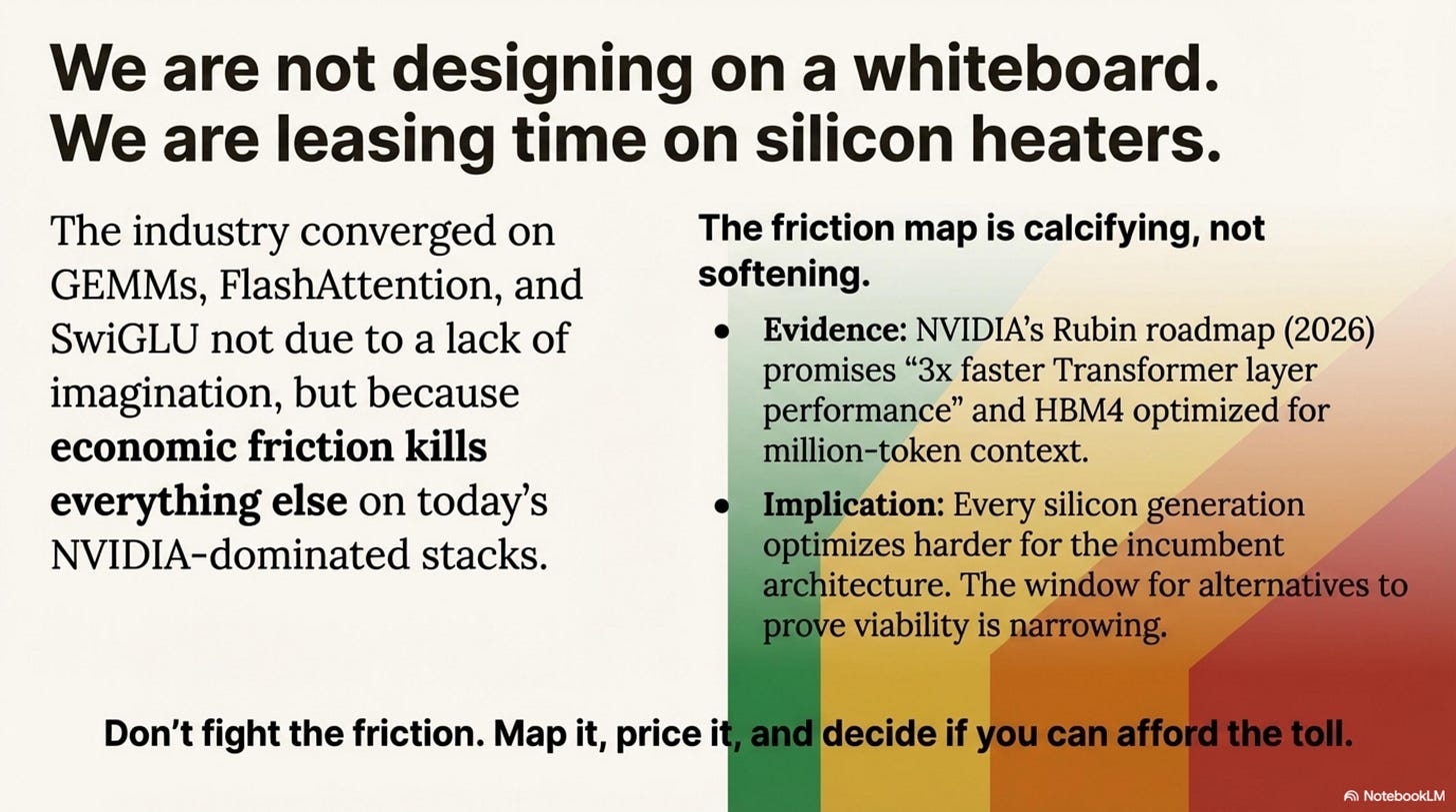 The friction map is calcifying, not softening. NVIDIA’s Rubin roadmap (2026) promises “3× faster Transformer layer performance” and HBM4 optimized for million-token context. Every silicon generation optimizes harder for GEMMs. The window for alternative architectures to prove viability is narrowing—not because alternatives can’t work, but because the cost of making them work rises with every hardware generation.