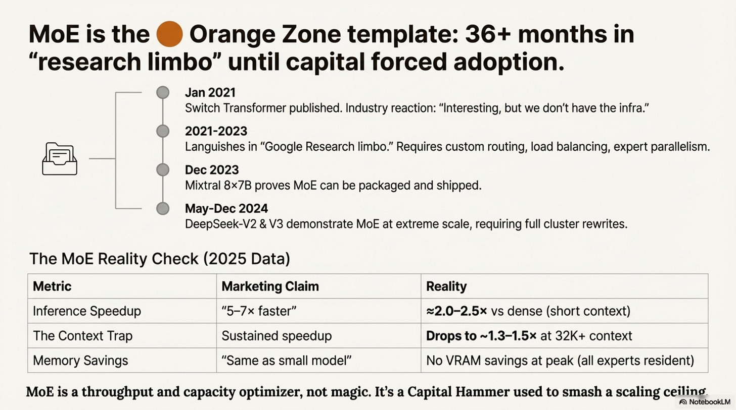 Mixture-of-Experts tells a different story—36+ months from “research curiosity” to “production standard,” because the friction was systemic, not just kernel-level: