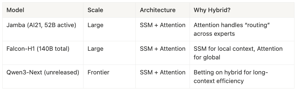 - Institutional risk: Labs willing to spend $50M+ on a training run won’t accept a 3× compute tax when hybrids offer SSM benefits with Transformer reliability.
