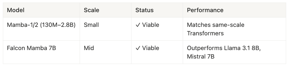 At ≤7B scale (🟠 Orange Zone): Pure SSMs are production-viable. Falcon Mamba 7B (September 2024) outperformed Llama 3.1 8B and Mistral 7B on multiple benchmarks while offering faster inference. The training parallelism penalty exists but is survivable—community teams and mid-sized labs can absorb the compute tax. Mamba-1 and Mamba-2 at 130M–2.8B parameters match same-scale Transformers across the board.