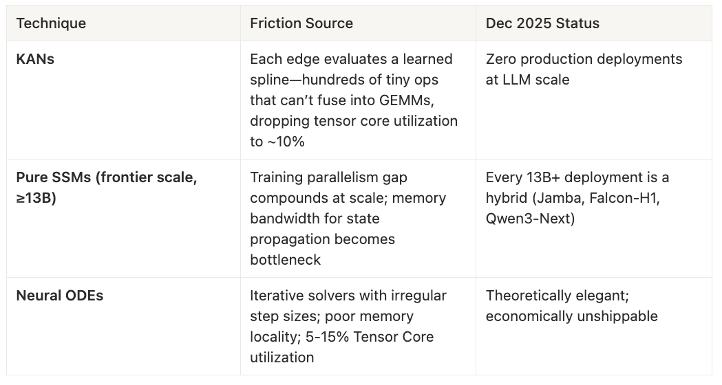 Kolmogorov-Arnold Networks (KANs) exemplify architectural incompatibility. Each edge evaluates a learned spline function—hundreds of tiny, irregular operations that cannot batch into dense matmuls. Tensor core utilization drops to roughly 10%. As of December 2025, there are zero production deployments at LLM scale. Pure SSMs at frontier scale (≥13B parameters) face different but equally brutal friction: the training parallelism gap compounds with model size, and memory bandwidth for sequential state propagation becomes the bottleneck.