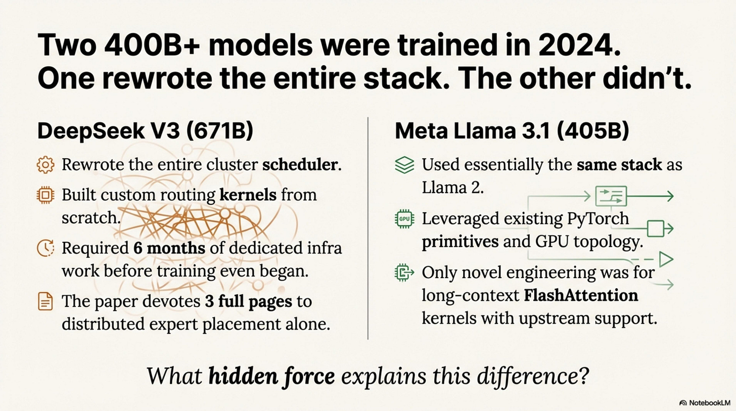 In December 2024, DeepSeek shipped V3—a 671B-parameter model with 256 experts. Training it required rewriting the entire cluster scheduler, custom-building routing kernels, and six months of dedicated infrastructure work before the first training run began. The architecture paper devotes three full pages to distributed expert placement alone.