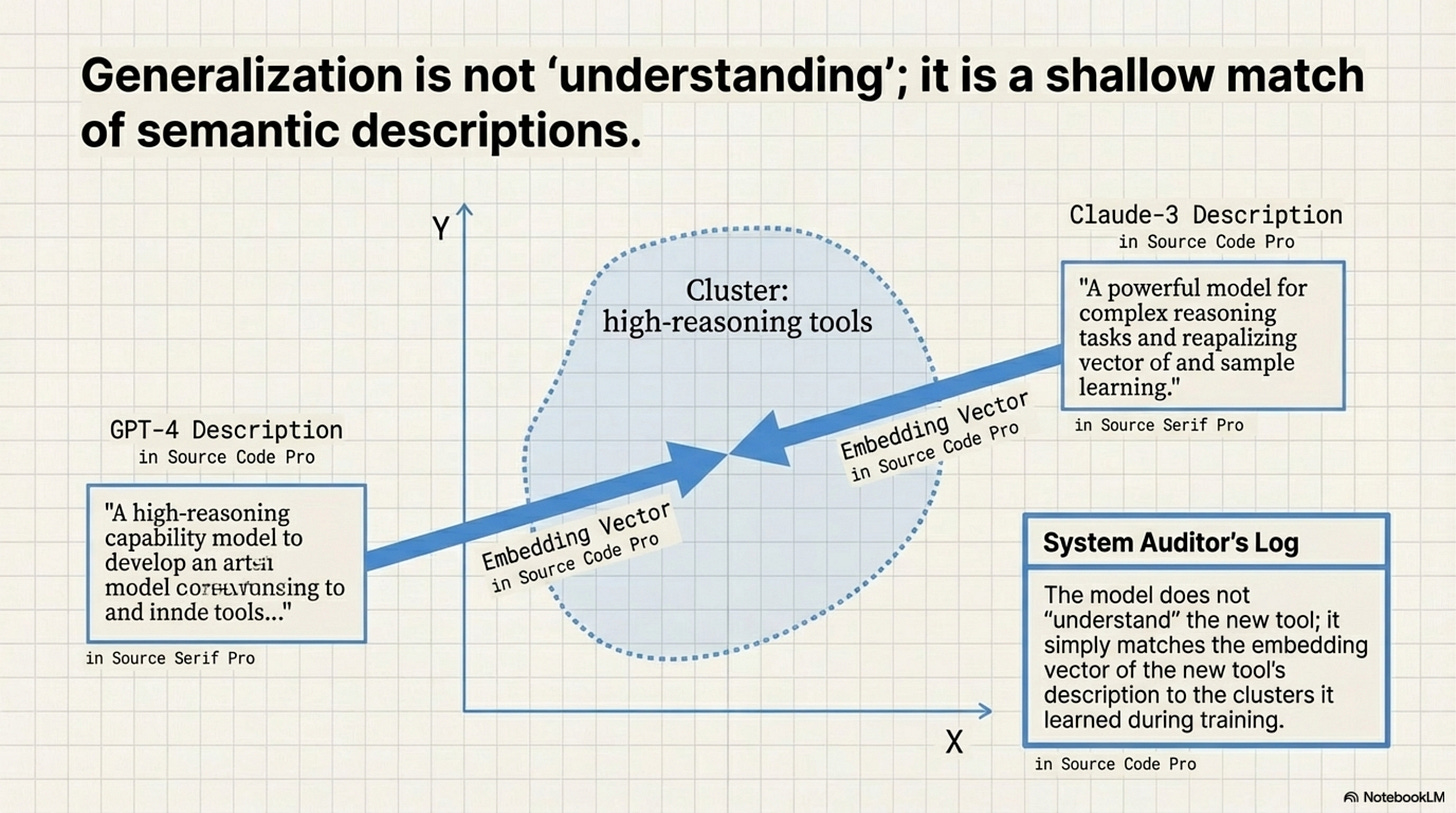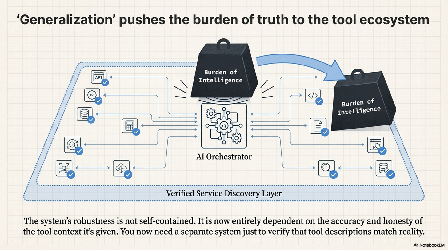 The system’s generalization is entirely dependent on the Accuracy and Honesty of the Tool Context. It pushes the complexity from the “Model” to the “Service Discovery Layer.” You now need a separate system just to verify that tool descriptions match reality.