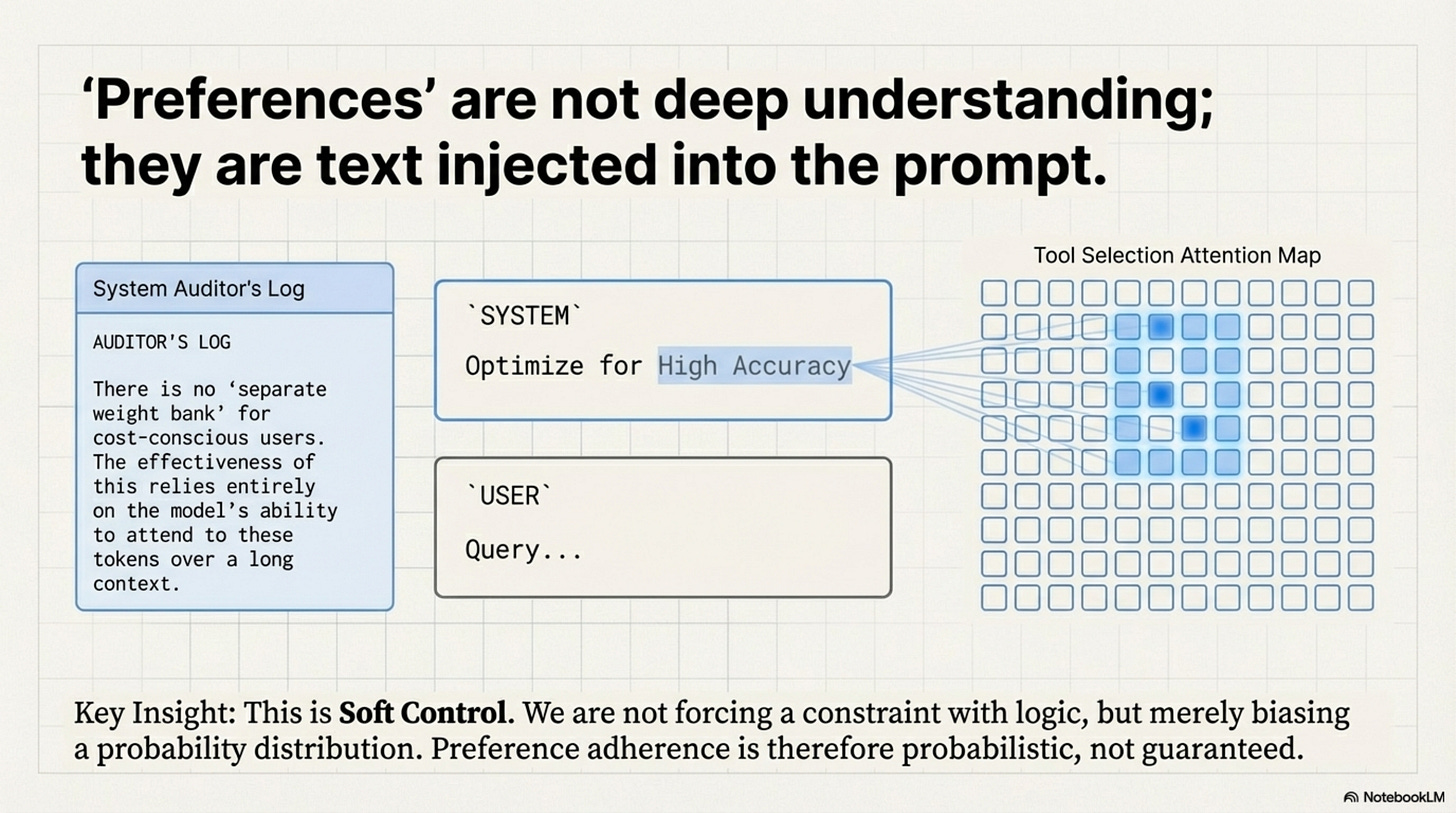 This is Soft Control. We are not mathematically forcing the constraint like a hard logic gate; we are biasing the probability distribution. This implies that Preference Adherence is Probabilistic. A user might set Cost = 0 (Infinite Budget), but the model might still choose a cheap tool because the stochastic sampling just happened to pick it.