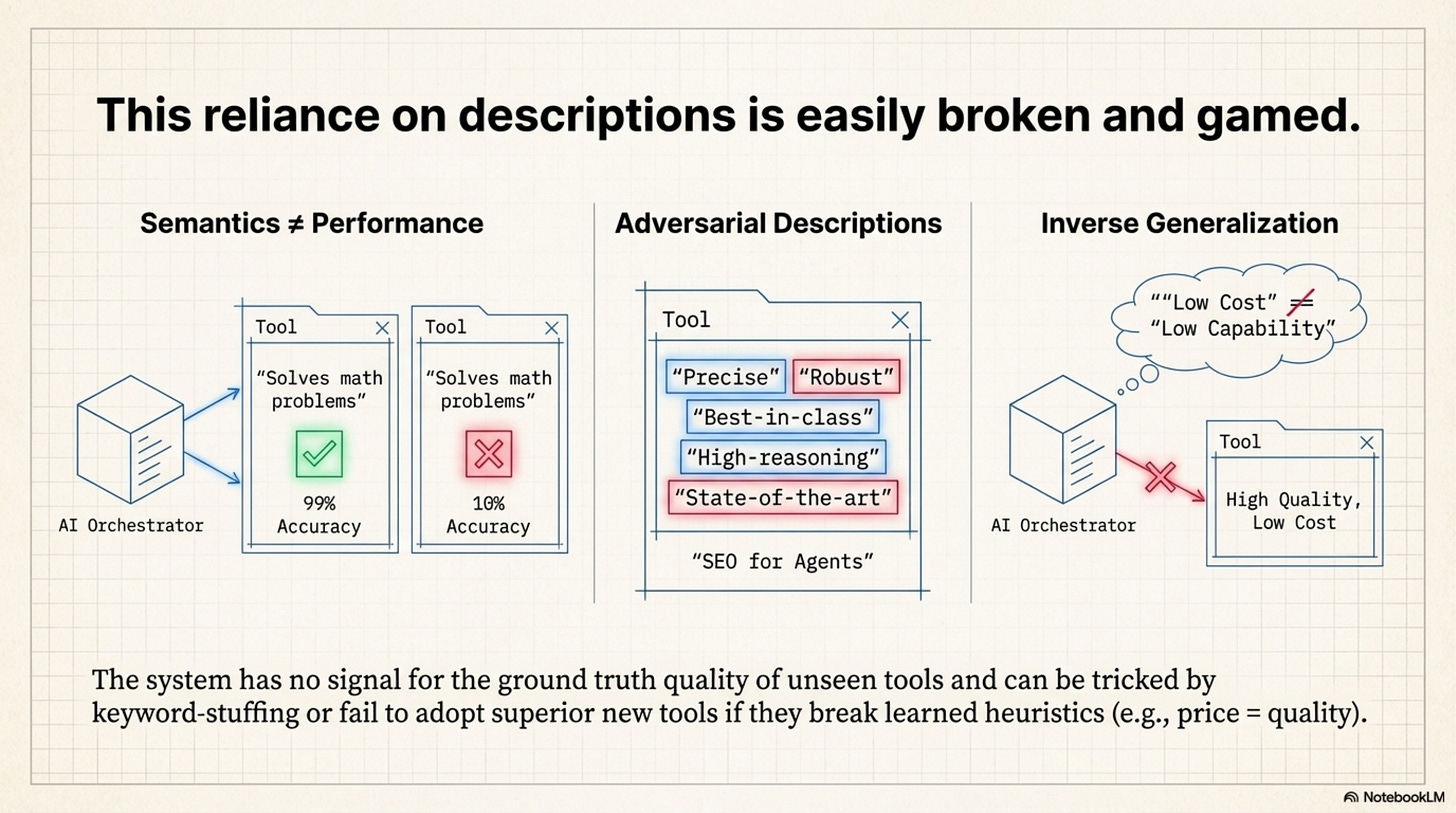 Semantics vs. Performance: A tool description says what it does, not how well it does it. Tool A might describe itself as “Solves math problems” but have 10% accuracy, while Tool B has 99% accuracy. To the orchestrator, these look identical because their descriptions are semantically similar. It has no signal for Ground Truth Quality of unseen tools.