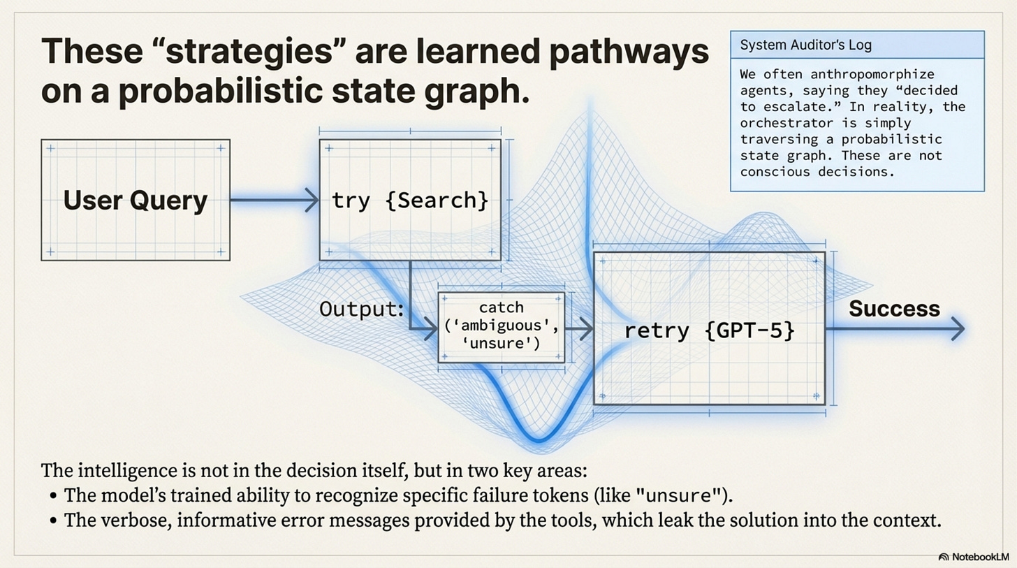 [!NOTE] System Auditor’s Log: We often anthropomorphize agents, saying they “decided to verify” or “chose to escalate.” In reality, the orchestrator is simply traversing a probabilistic state graph. The “strategies” observed in the paper, like the “Escalation Ladder”, are emergent properties of the reward landscape, not conscious decisions. They are the path of least resistance on the loss surface.