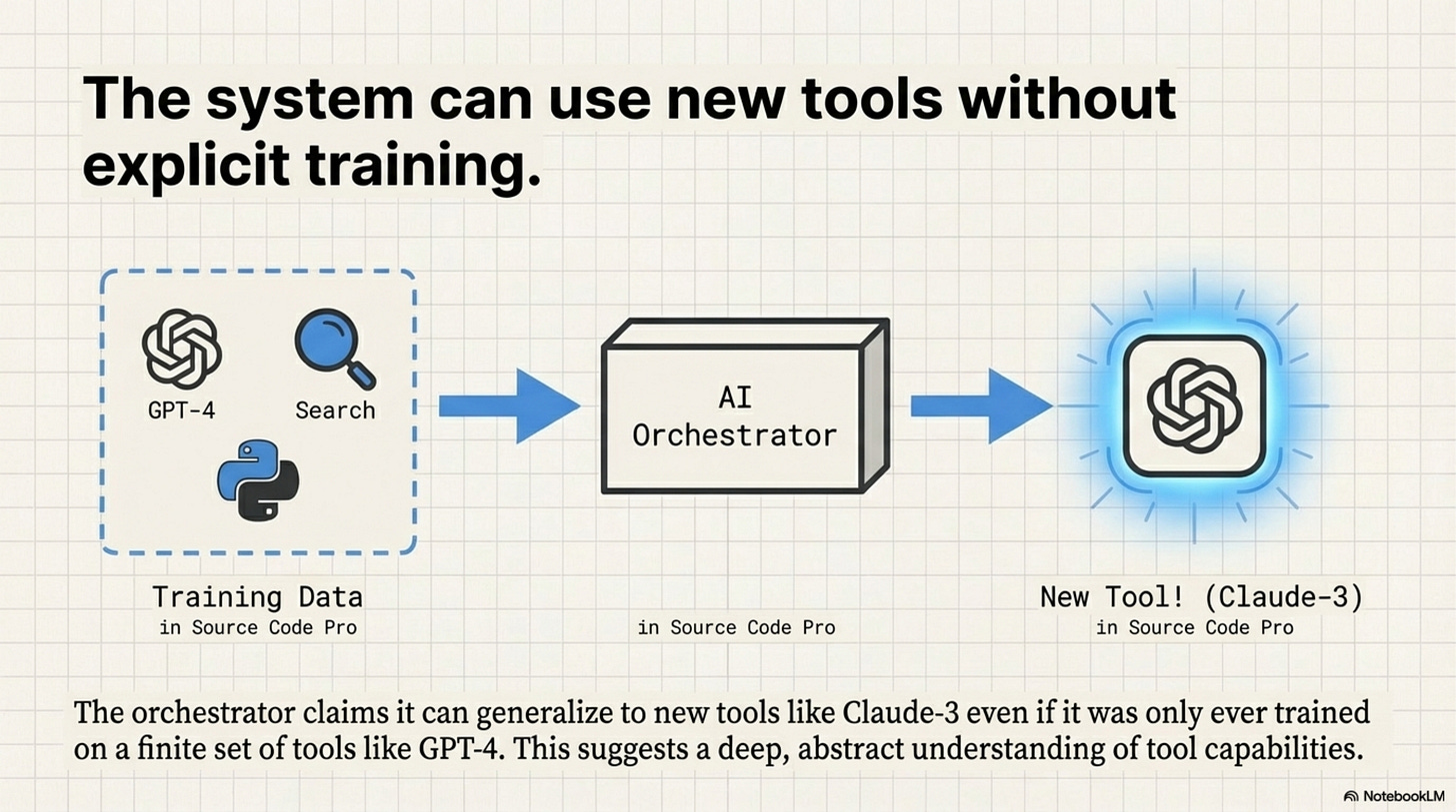 [!NOTE] System Auditor’s Log: The “Generalization” claim, that the orchestrator works on tools it hasn’t seen, is the most dangerous claim in the paper. It implies a robustness that contradicts how Transformers work. The model does not “understand” the new tool; it simply matches the embedding vector of the new tool’s description to the clusters it learned during training.