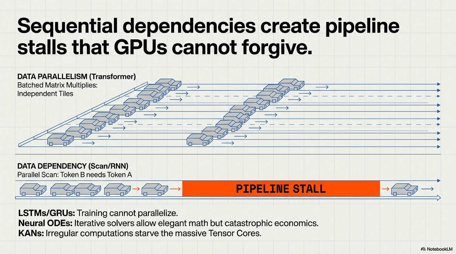 - Kolmogorov-Arnold Networks (KANs): Per-edge spline function evaluations cannot be batched into large matrix operations. Hundreds of tiny, irregular computations starve Tensor Cores.