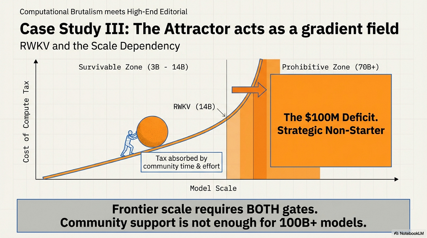 RWKV proves that the Transformer attractor is not a binary trap—it’s a gradient field that strengthens with scale. Alternatives have breathing room at research and mid-scale deployments. But frontier scale (70B+) requires both gates simultaneously. Without major lab capital ($50M+ training budgets) and infrastructure (100K+ GPU clusters), you won’t reach 400B parameters, regardless of community persistence.