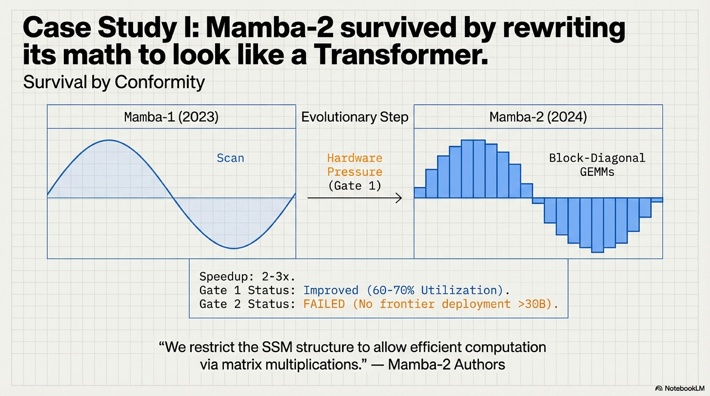 Mamba-2 improved its hardware compatibility dramatically but still failed to attract institutional backing. The question is whether it failed Gate 1 at frontier scale or failed Gate 2 despite clearing Gate 1. Without public 30B+ training runs, we cannot know.