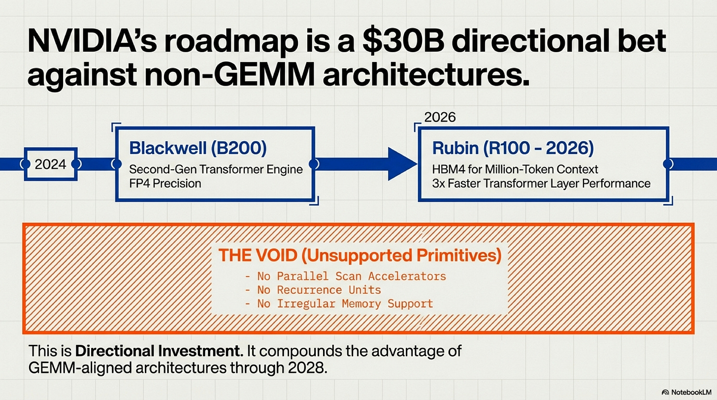 NVIDIA’s three-year roadmap is an implicit $30B bet that Transformers will remain dominant through at least 2028. This is not neutral infrastructure. It is directional investment that compounds the competitive advantage of GEMM-aligned architectures every silicon generation.