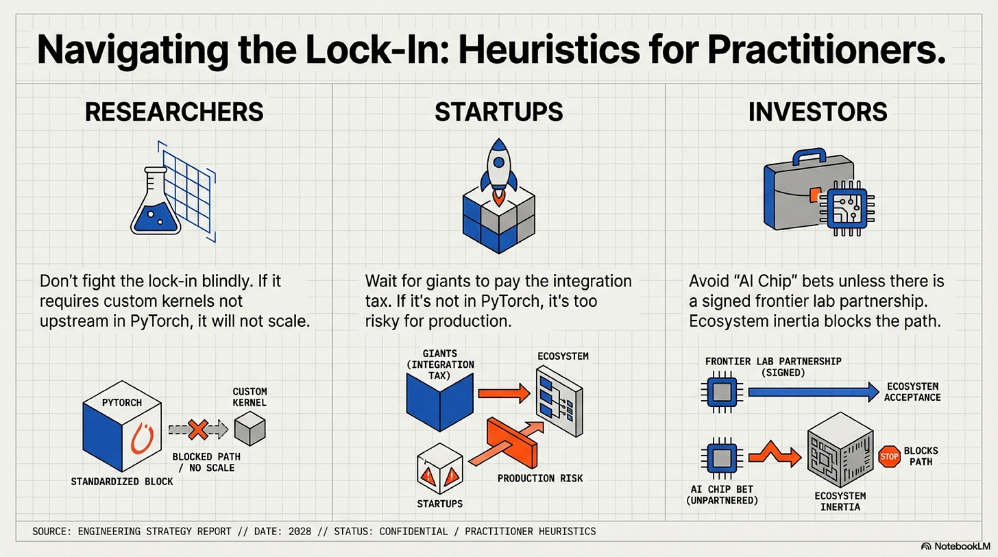 Heuristic: If it’s not in PyTorch upstream with optimized kernels, wait for the giants to pay the integration tax. You ride on their work once it lands. FlashAttention became viable for startups only after it was battle-tested at Meta and upstreamed to PyTorch. RetNet and Mamba-1 never reached that threshold.
