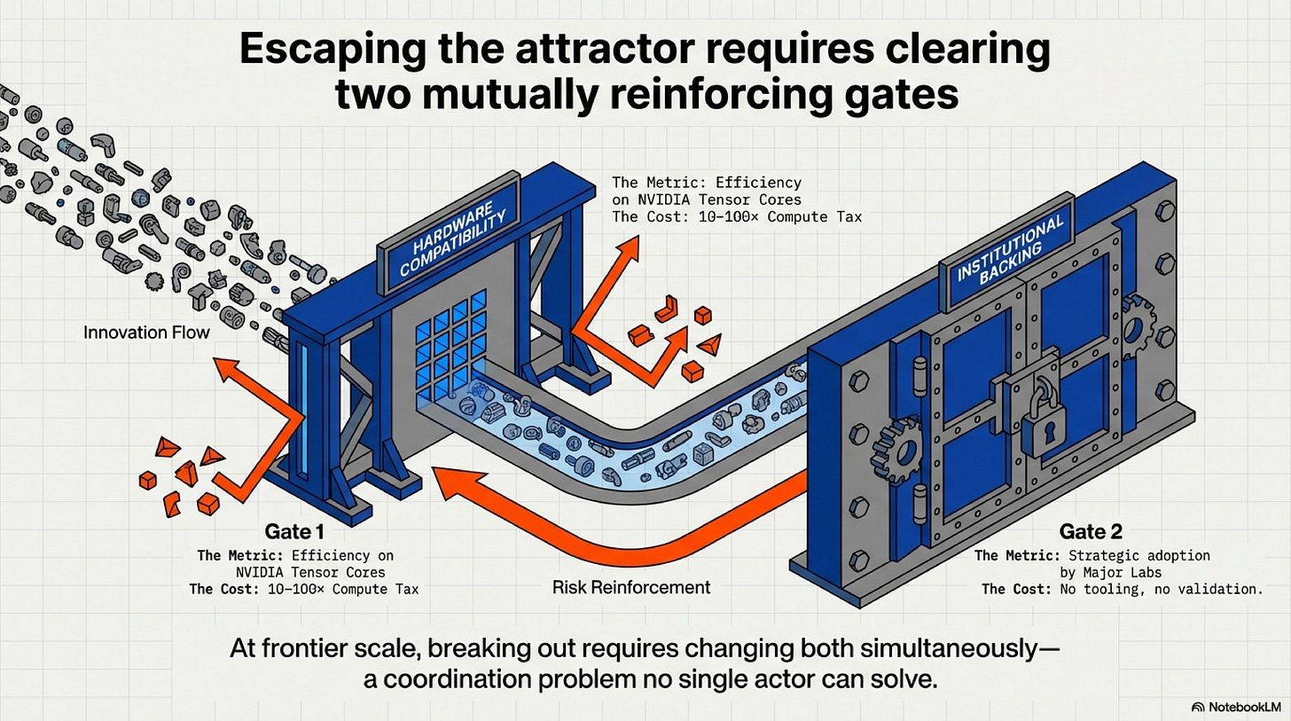 Why the trap is stable: These gates reinforce each other. Poor hardware compatibility makes institutional bets unattractive (too risky, too expensive). Lack of institutional backing means no investment in custom kernels or hardware optimization, keeping Gate 1 friction permanently high. At frontier scale, breaking out requires changing both simultaneously—a coordination problem no single actor can solve.