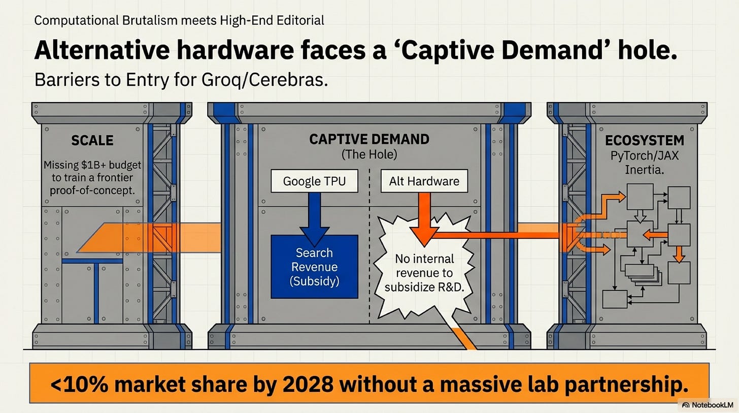 The TAM for “alternative AI chips” is constrained by structural barriers, not raw capability. Cerebras and Groq can build superior silicon for specific workloads, but they cannot unilaterally overcome the scale barrier, captive demand hole, and ecosystem inertia.
