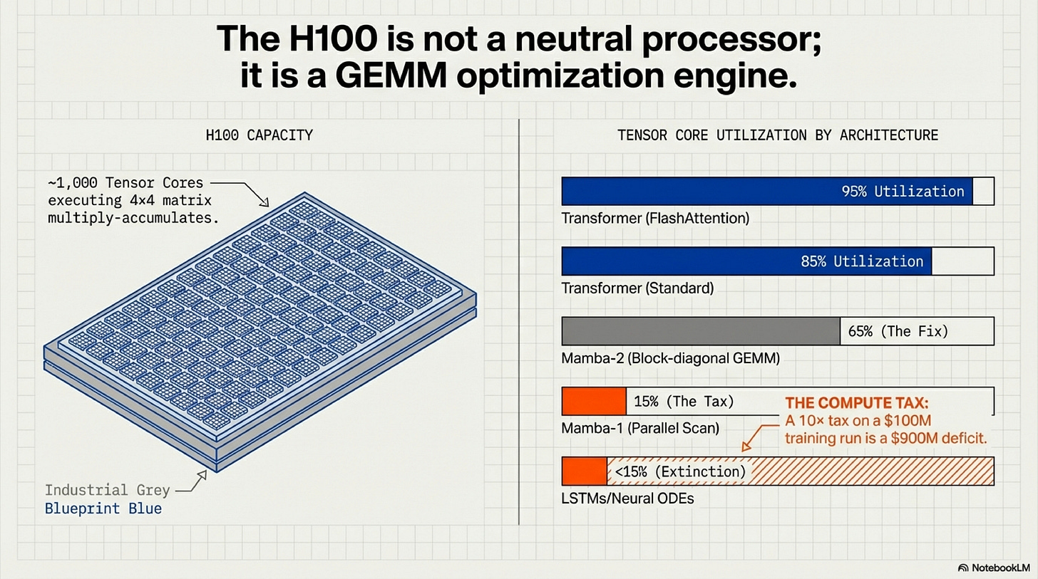 Can your architecture efficiently use NVIDIA’s Tensor Cores—the specialized matrix-multiply units that deliver 1,000 TFLOPS on an H100? If not, you pay a 10–100× compute tax. At frontier scale ($50–100M training runs), that tax is extinction.