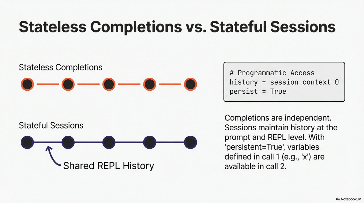Persistence is orthogonal. With `persistent=True`, the REPL state survives across independent completion calls: