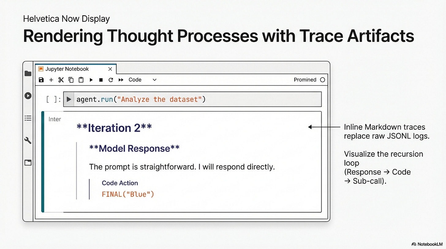 The Jupyter integration provides the answer. Human and model share a REPL. When the trace reveals a mistake, you can intervene: modify a variable, add a document to the filtered set, re-execute from the point of failure. The paradigm becomes collaborative. The model proposes a decomposition; you inspect it; you correct what it got wrong; execution continues with your correction in place.