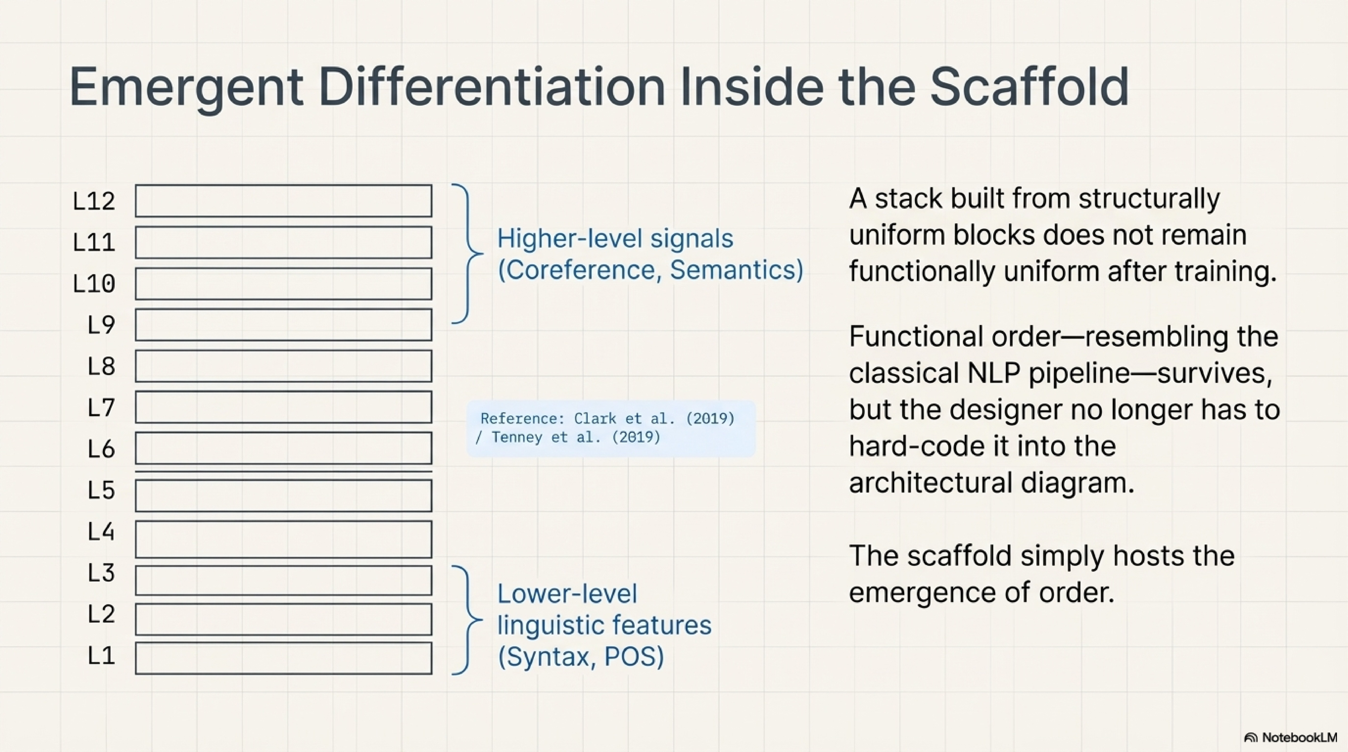 The BERT analyses matter because they show what can happen inside such a repeated scaffold once training has enough room to differentiate roles. Clark and colleagues find attention heads that specialize in recognizable behaviors such as positional offsets, delimiter handling, syntactic relations, and some coreference-linked patterns. Tenney and colleagues, working at the level of probing tasks across layers, find a broad ordering in which lower-level linguistic information becomes legible earlier and higher-level signals later, in a sequence reminiscent of the classical NLP pipeline. Used carelessly, those results invite a mythology in which transformers secretly contain a neat modular hierarchy waiting to be named. Used properly, they support a narrower conclusion that matters more. A stack built from uniform blocks need not remain functionally uniform after training. Differentiation can emerge inside a repeated scaffold without being hard-coded into separate architectural compartments. That matters because it changes where the designer has to spend architectural creativity. Instead of drafting one module for syntax and another for semantics, the designer can create a repeated environment in which such role separation is likely to emerge. Functional order survives, but it no longer has to be drawn directly into the diagram from the start (Clark et al., 2019; Tenney et al., 2019).