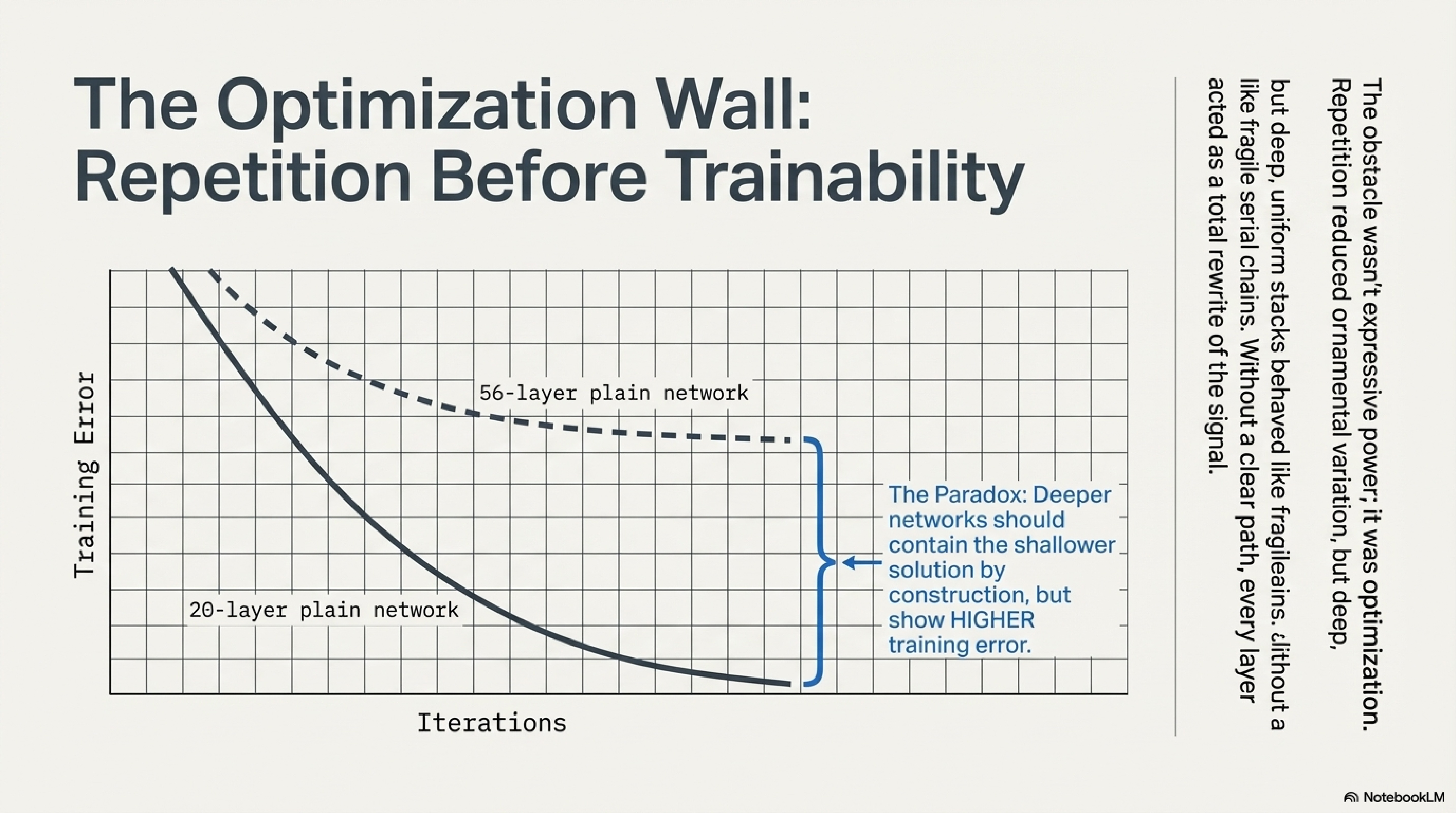 That unresolved problem matters because it kept the field from turning architectural regularity into a reliable scaling method. The obstacle was not expressive power in the abstract. It was optimization. The ResNet paper states the issue in its most useful form: deeper plain networks can show higher training error than shallower ones, even though a deeper model should contain the shallower solution by construction if the added layers can learn identity mappings. That result cuts against the comforting idea that one can simply keep stacking repeated modules and wait for gradient descent to sort things out. It also matters because it rules out an easy story in which depth failed only because the models overfit or because the training budget was too small. The deeper models were harder to fit in the first place. Once that degradation pattern becomes the central fact, the historical question changes. The problem is no longer whether repetition can be elegant. The problem is whether repeated depth can remain traversable enough for training to exploit it at all. Until the field had a real answer to that, the move away from bespoke stacks remained suggestive but incomplete (He et al., 2015).