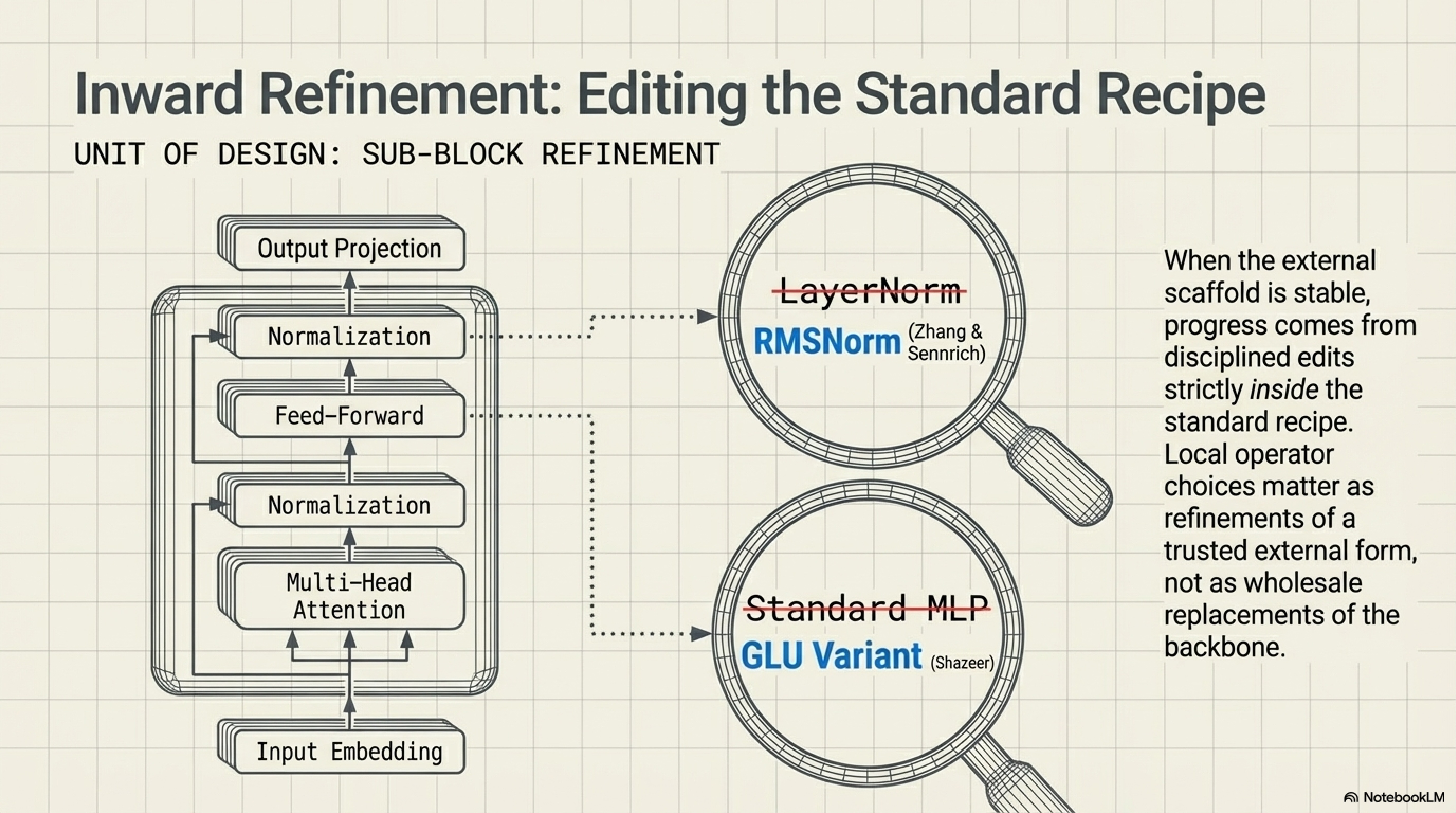 RMSNorm supports a narrow but important point about local operator refinement inside a stable block. It helps show how architectural progress continues after scaffold stabilization without requiring wholesale redesign.