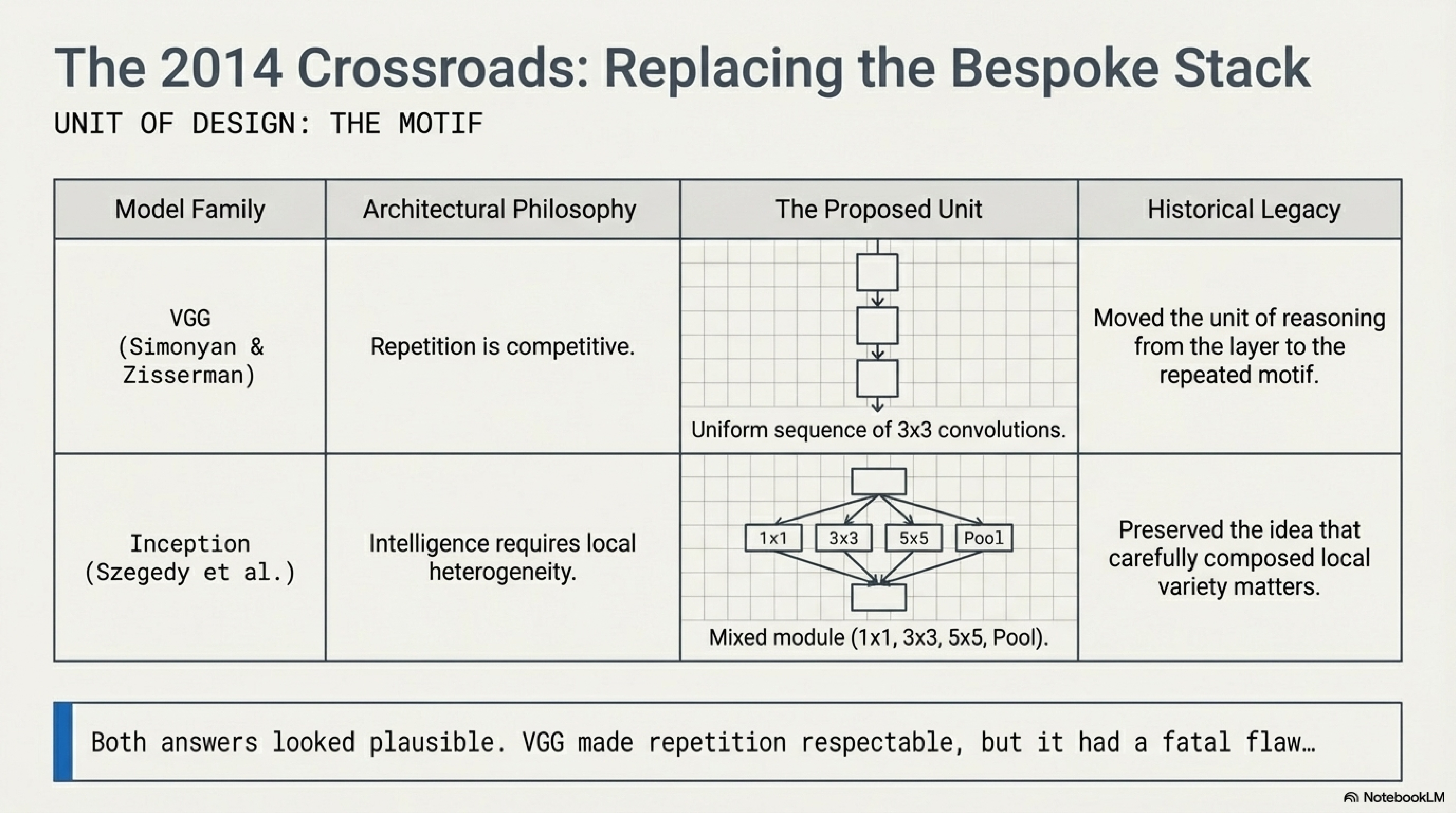 The next two landmarks matter because they show that the field had not yet converged on what should replace that bespoke style. VGG and Inception respond to the same pressure, but they respond in different directions. VGG shows that a network built from repeated 3x3 convolutions can outperform more decorated local designs. That was a serious simplification, and it changed what counted as architectural sophistication. Repetition no longer looked naive. It looked competitive. Inception took the opposite path. Instead of committing to one operator and repeating it, the model offers several transformations in parallel and lets training sort out their relative value inside each module. That branch is historically important because it keeps alive the idea that architectural intelligence might still reside in carefully composed local heterogeneity. Both papers are signs of transition rather than final settlement. VGG raises the credibility of repeated motifs. Inception preserves local heterogeneity as a live answer rather than a straw man. The historical point is not that one was smart and the other was confused. It is that the field was still deciding whether architecture should become more regular or more locally heterogeneous, and both answers still looked plausible in 2014 (Simonyan and Zisserman, 2014; Szegedy et al., 2014).