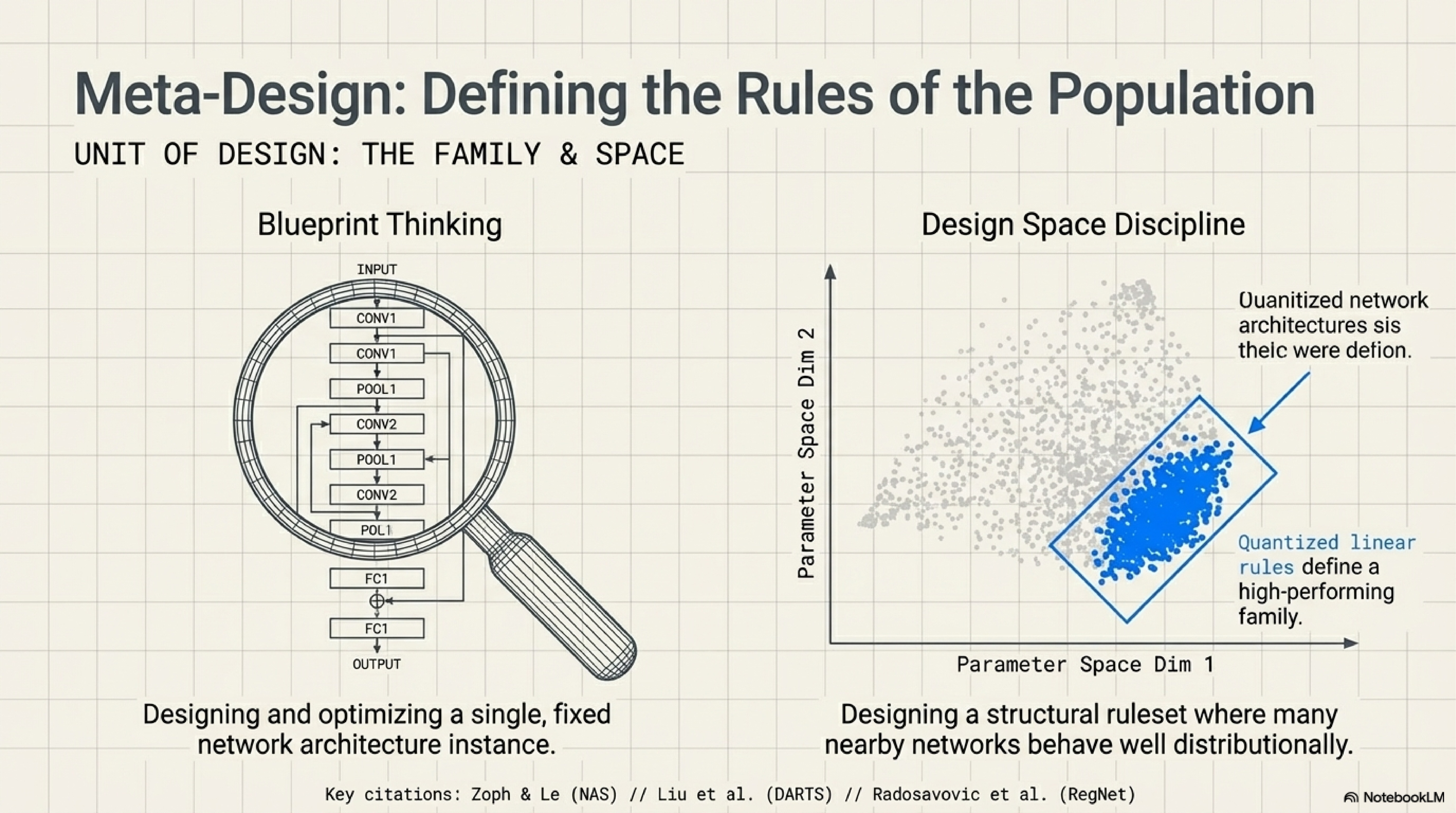 Once the field has a reliable block, the natural design question rises above the individual model instance. Neural architecture search made that shift explicit by treating the search space itself as a designed object. In the original NAS work, what is specified is no longer only a single architecture but a controlled population of admissible operations and compositions over which a search procedure can operate. DARTS sharpens the move by relaxing discrete architectural choices into a differentiable surface. Neither paper should be exaggerated into the literal driver of frontier large-model practice. Their value is historical and conceptual. They make it obvious that the object of design can be the space of possible models rather than one fixed diagram. RegNet states that turn even more cleanly. Radosavovic and colleagues explicitly design a network design space whose good models are governed by simple regularities and quantized linear rules, and they treat the quality of a design space as something to analyze distributionally rather than instance by instance. That distributional move matters because it changes what architectural understanding looks like. The goal is no longer only to explain why one network won. It is to define a regime in which many nearby networks behave well for reasons that can be stated simply. At that point architecture is no longer just a blueprint. It is a family discipline: a population of architectures sharing one structural rule set (Zoph and Le, 2017; Liu et al., 2019; Radosavovic et al., 2020).