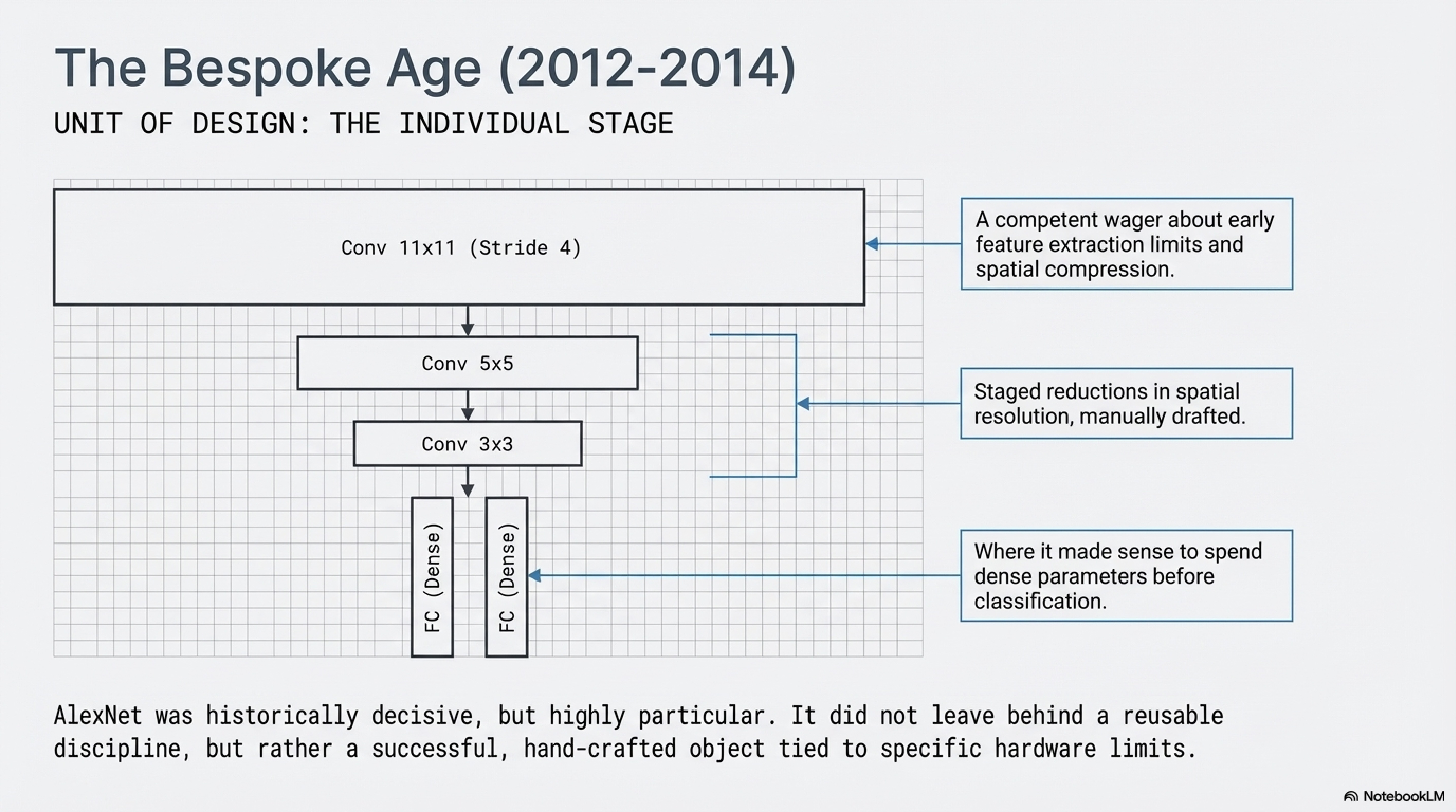 For a long stretch of deep learning history, architecture design meant deciding what each part of a network should do. That older picture was not a misunderstanding. It fit the technical reality of the time. When AlexNet appeared, its large early filters, staged reductions in kernel size, pooling pattern, and fully connected head all expressed a concrete view about how visual abstraction should be assembled under the combined pressures of ImageNet-scale data and GPU-bound training. The achievement was not only that the model was deep enough and trained hard enough. It was also that the diagram itself still carried a large share of the designer's judgment about the order in which the representation should become more invariant, more selective, and more task-ready. Early deep learning systems were still close enough to feature-engineering culture that one could point to a stage and say what kind of operation it was supposed to specialize in. Architecture still looked like the construction of a specific machine, not the definition of a reusable regime (Krizhevsky et al., 2012).