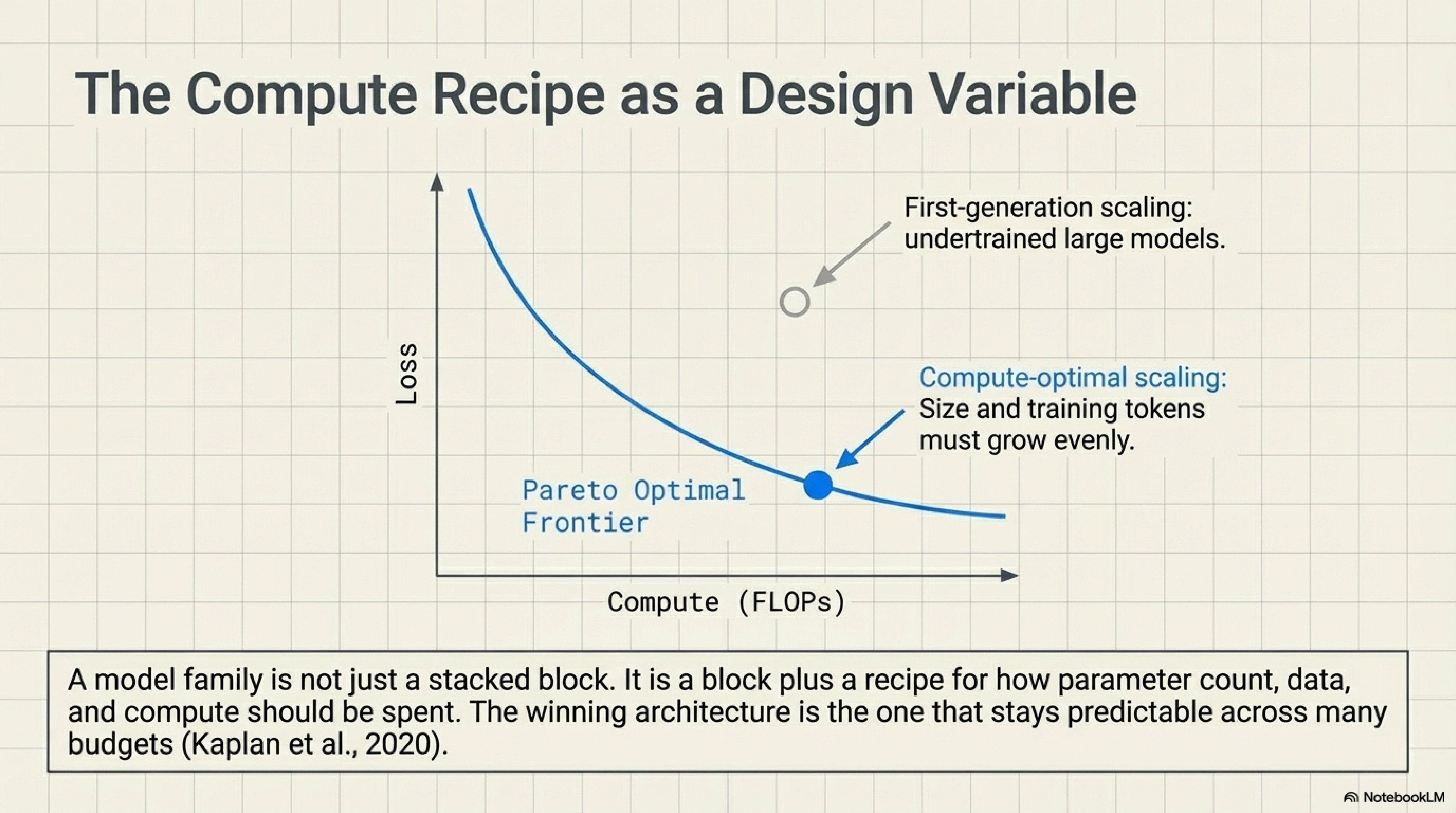 At that point the design target is no longer only the family topology. It is also the compute recipe that decides how the family should be trained and budgeted: