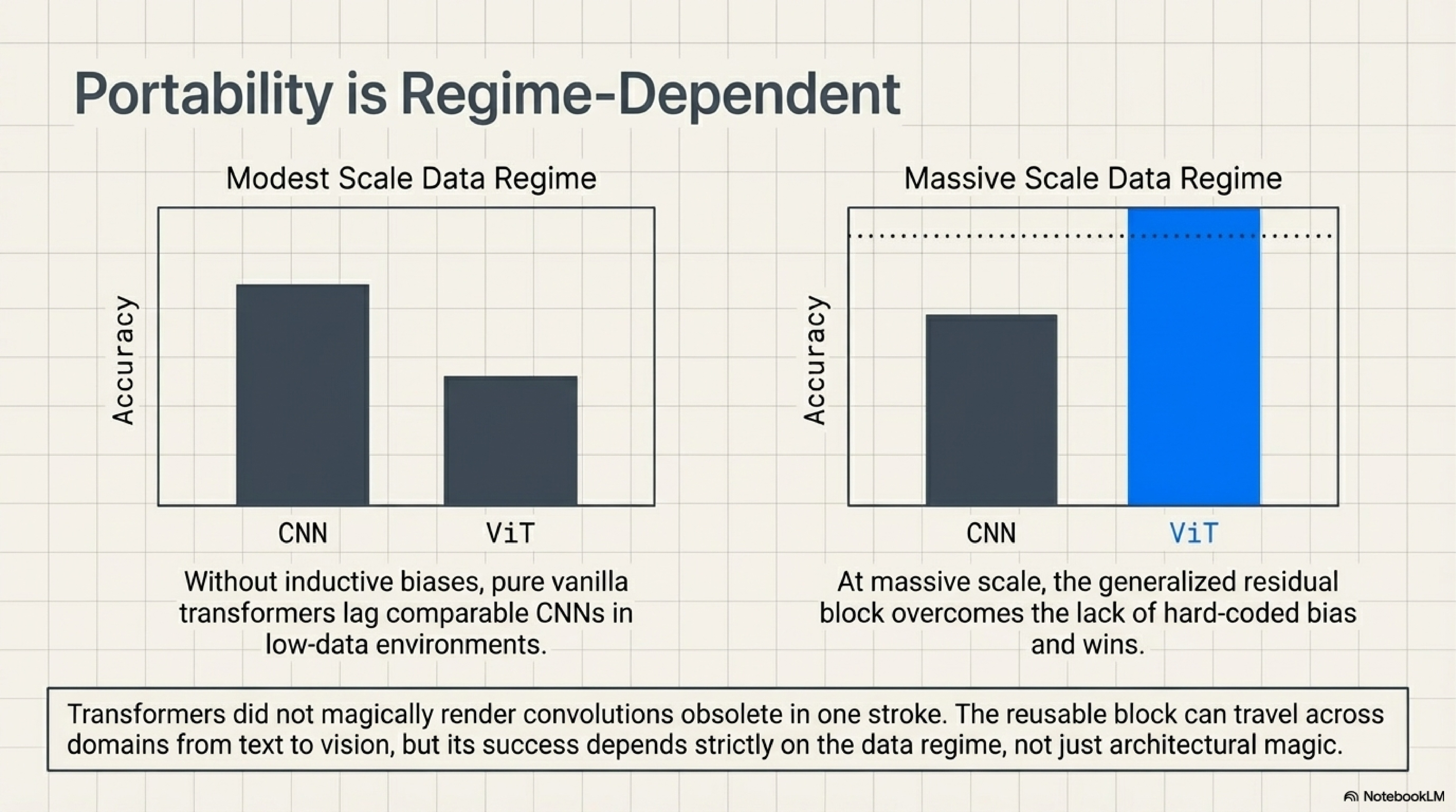 ViT matters not because it proves universal portability, but because it shows the portable block becoming viable only once the surrounding data regime is large enough: