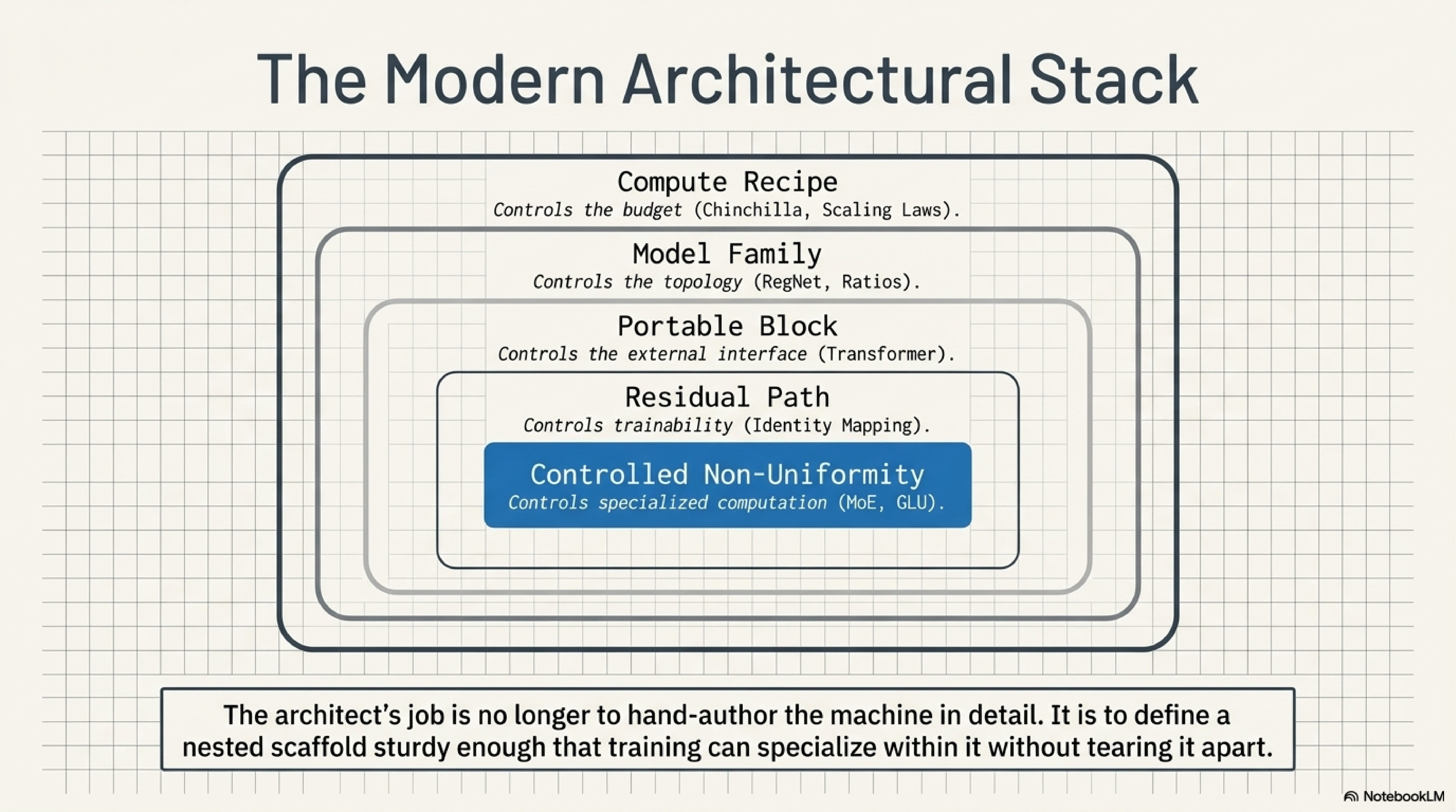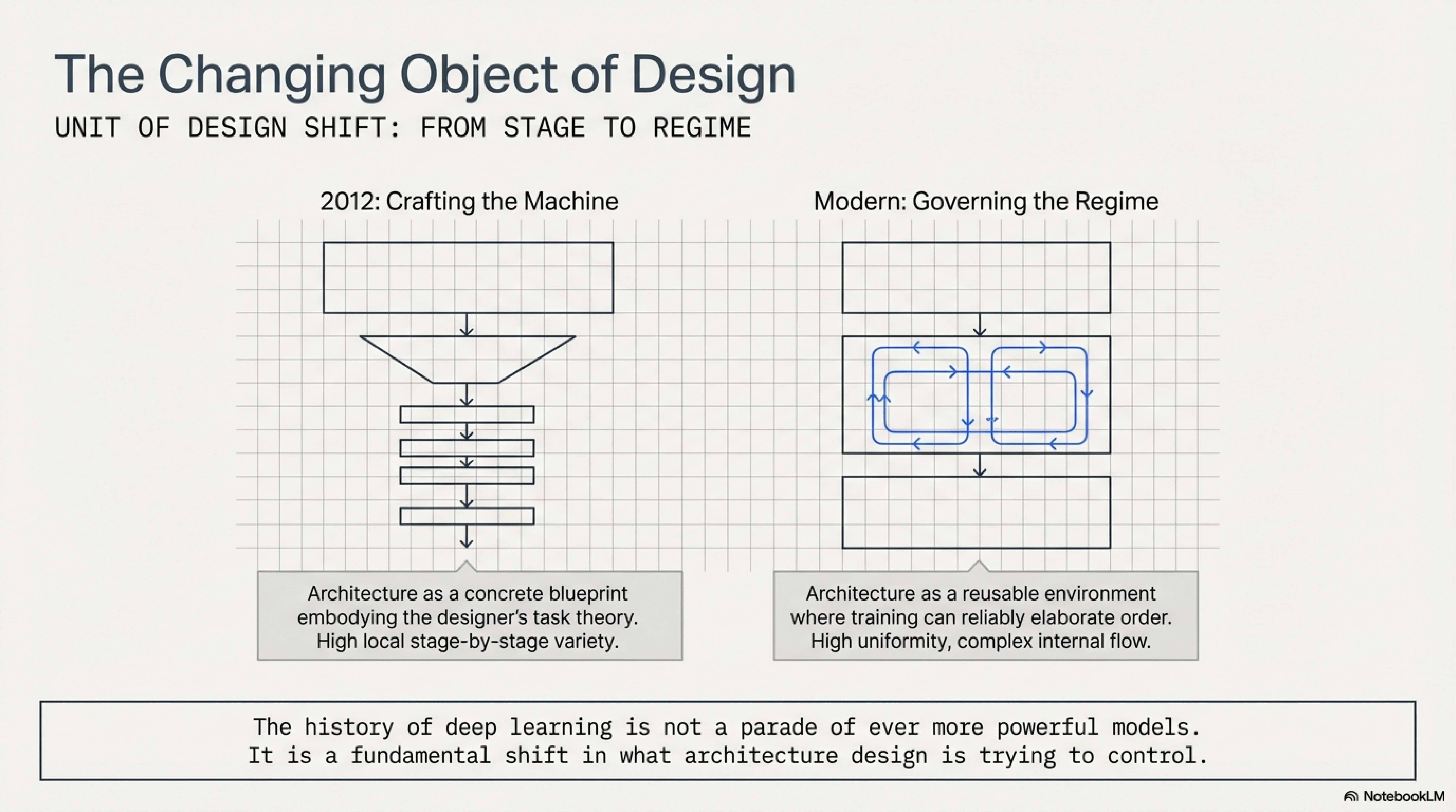 The deeper change is that architecture ceased to be the place where one scripts competence layer by layer and became the place where one specifies which kinds of order training can reliably elaborate. That is why modern architectural progress can look oddly conservative on the surface. The diagram changes less because the real object under refinement is no longer the individual model but the regime that can survive repetition, scale, and controlled exception. Older criteria for architectural cleverness therefore lost prestige. A model no longer matters because it presents a novel internal diagram. It matters when its governing scaffold can absorb depth, transfer, and local specialization without becoming opaque or brittle. The architect's job is no longer to hand-author the machine in detail. It is to define a scaffold sturdy enough that training can specialize within it without tearing it apart.