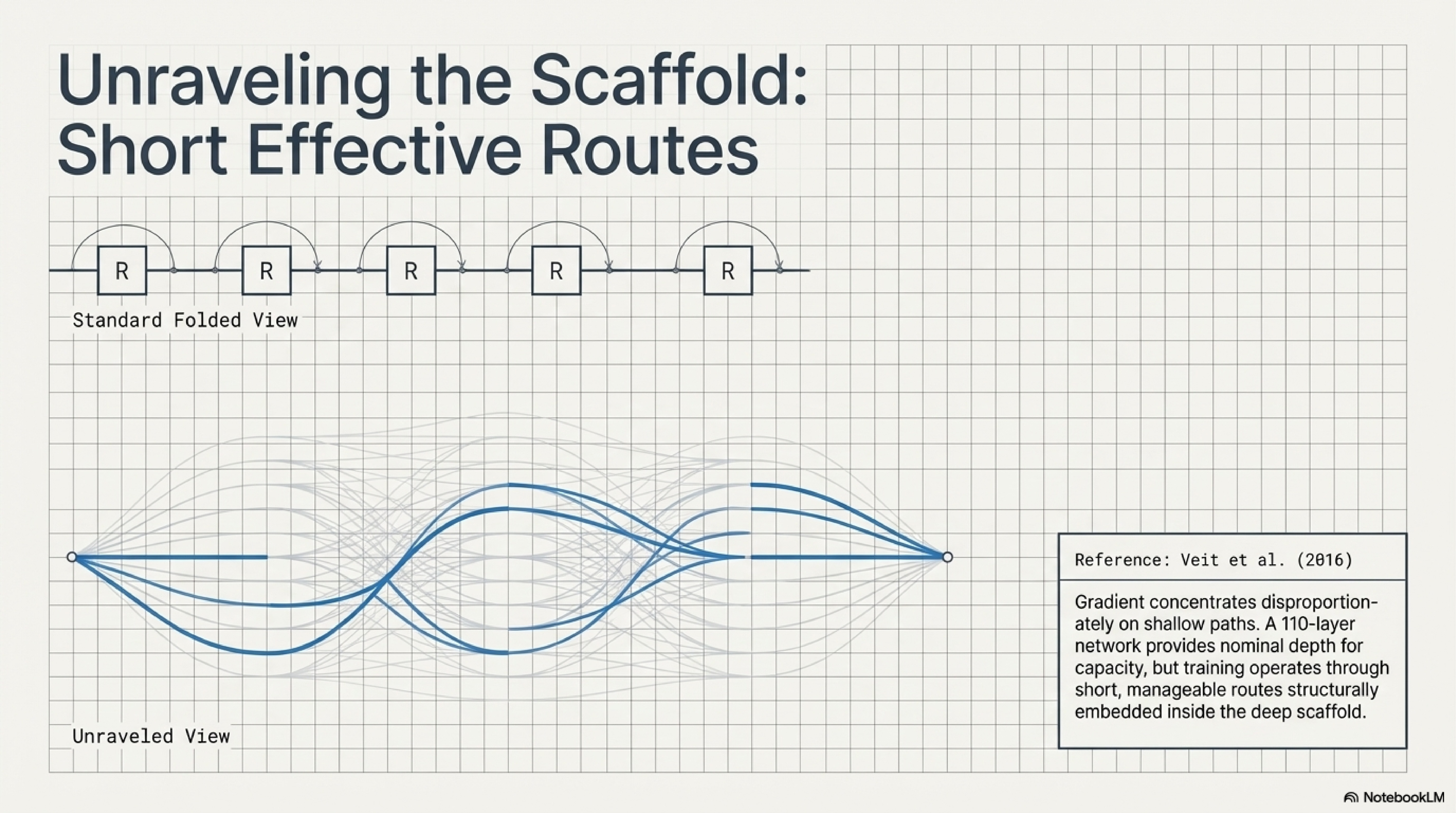 Veit and colleagues make that point legible from another angle. Their famous "ensemble" framing is often quoted too loosely, as if ResNet had been explained away into a bag of shallow subnetworks. The better reading is pathwise rather than sloganistic. Once the residual network is unraveled into many routes of different lengths, the surprising fact is not just that many such paths exist. It is that the gradients doing useful training work concentrate disproportionately on relatively short paths, even inside a very deep model. A 110-layer network can receive most of its gradient through paths much shallower than its nominal depth. Full nominal depth still matters as capacity and representational room. What changes is how residual design makes that depth usable by embedding short effective routes inside a deep scaffold. Training no longer has to push every signal through one uninterrupted tower. The scaffold is deep, while the usable routes through it remain manageable (Veit et al., 2016).