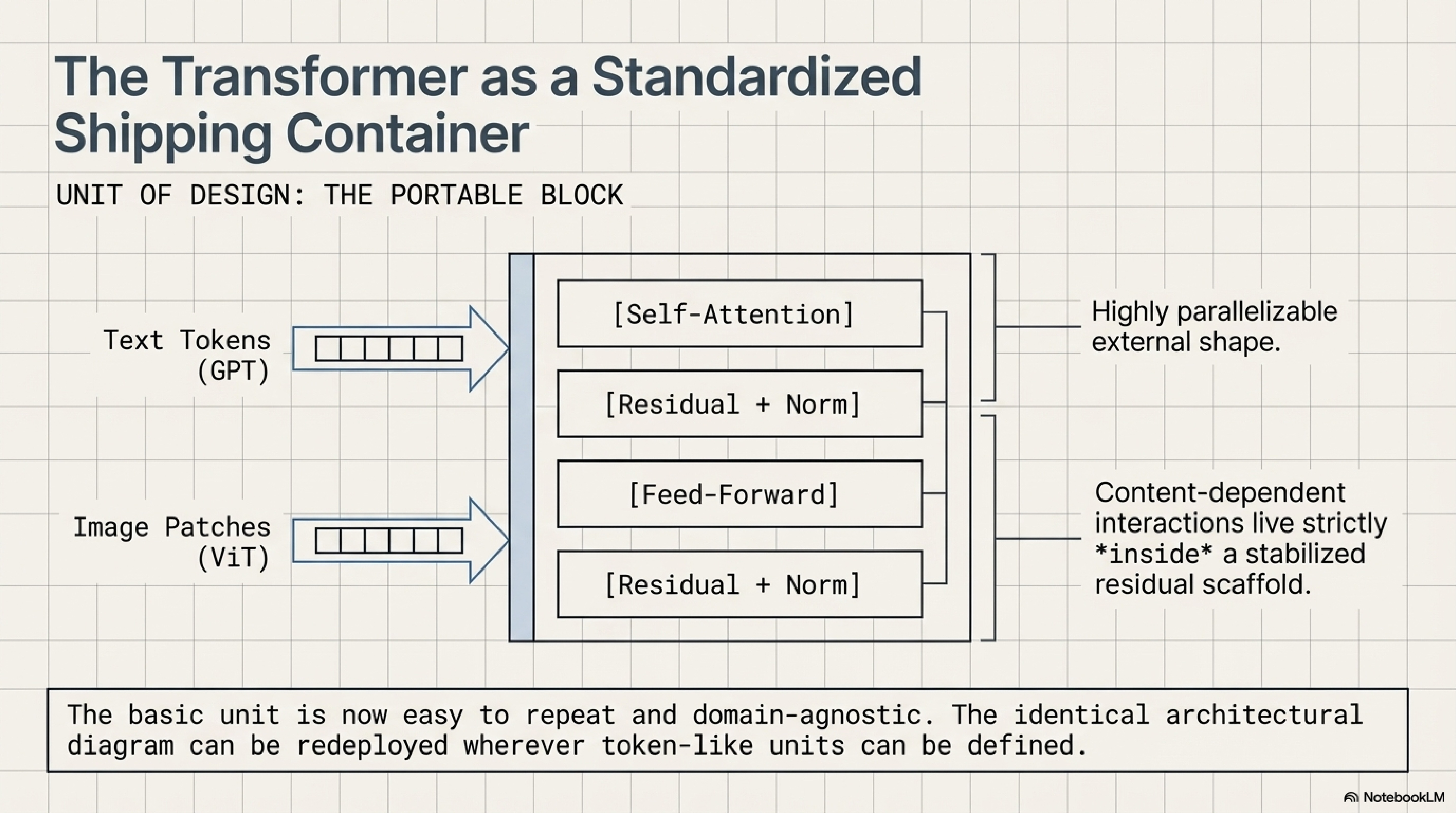 x = x + MLP(LayerNorm(x))Inside that block, self-attention gives every position access to content-dependent interactions across the sequence, but the larger architectural point is that those interactions now live inside a residual scaffold that can be stacked without redesigning the computation at each depth. The dominant sequence models before this point had to carry their long-range reasoning through recurrent time or through convolutional approximations to it. The transformer instead packages self-attention and feed-forward computation into a portable block with a clean interface to the next layer. That makes two things simultaneously true. The model is more parallel in hardware terms, and its basic unit is easier to repeat as a design object. It also shortens the architectural distance between domains. Once the core unit is "residual block plus content-dependent mixing plus pointwise expansion," the same diagram can plausibly be redeployed wherever tokens or token-like units can be defined. The transformer therefore does not merely replace one primitive with another. It carries residual path discipline into a block recipe that can travel beyond the problem on which it was born (Vaswani et al., 2017).