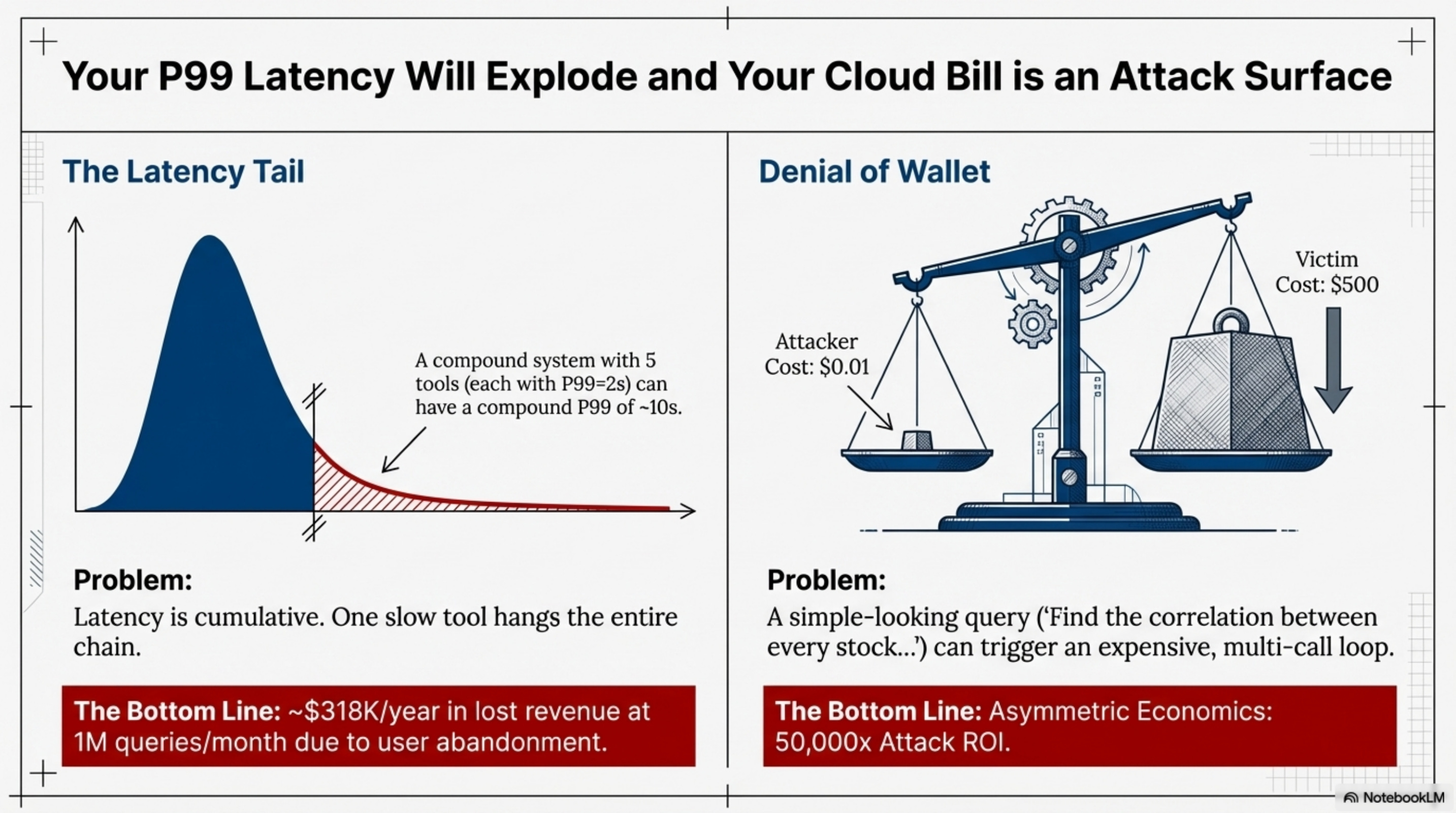 In a single model call, latency is predictable. In an orchestration loop, latency is Cumulative. If any single tool in the chain hangs, the entire request hangs. If you ignore this, your P99 latency will be dominated by the slowest tool in your chain, causing users to abandon the product. Revenue impact can be massive.