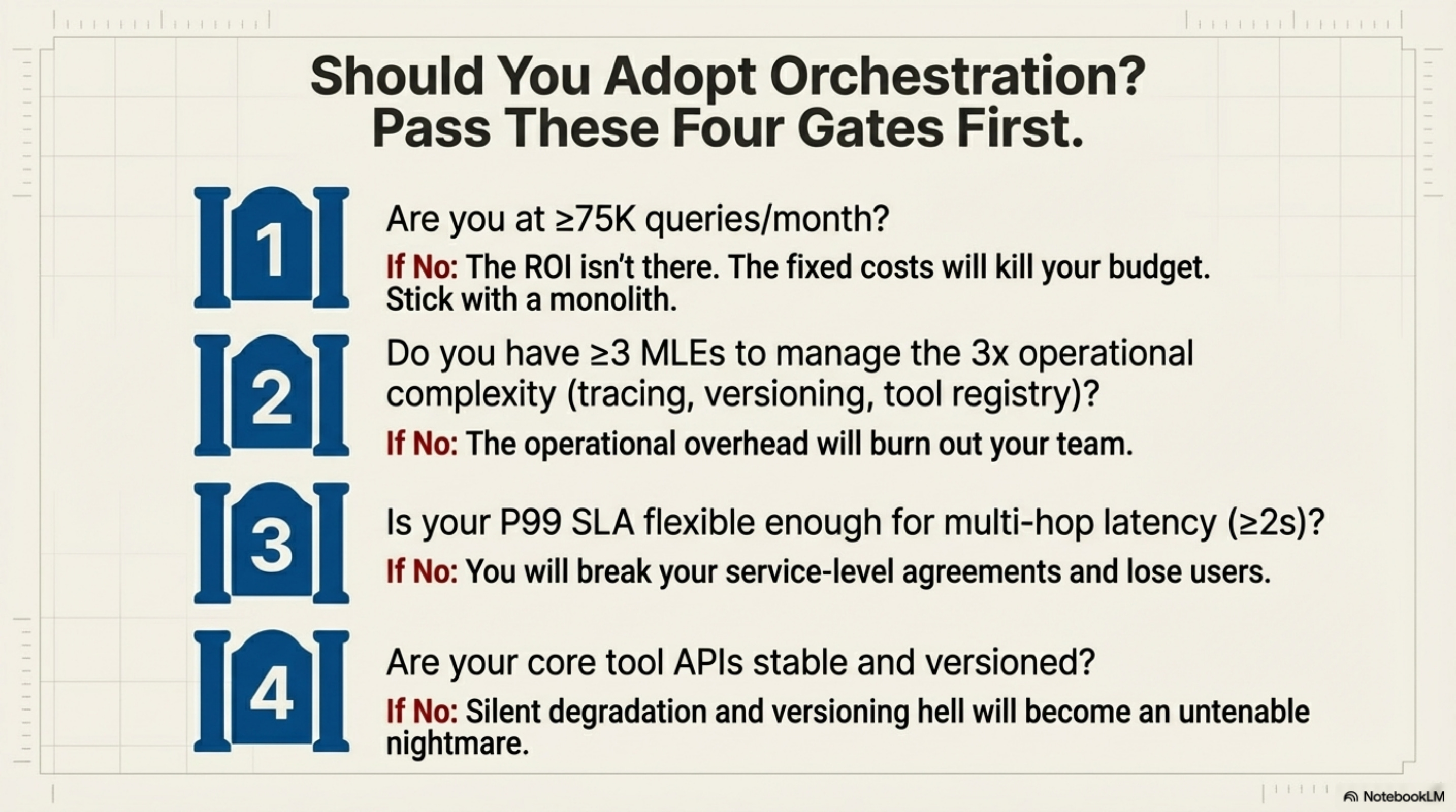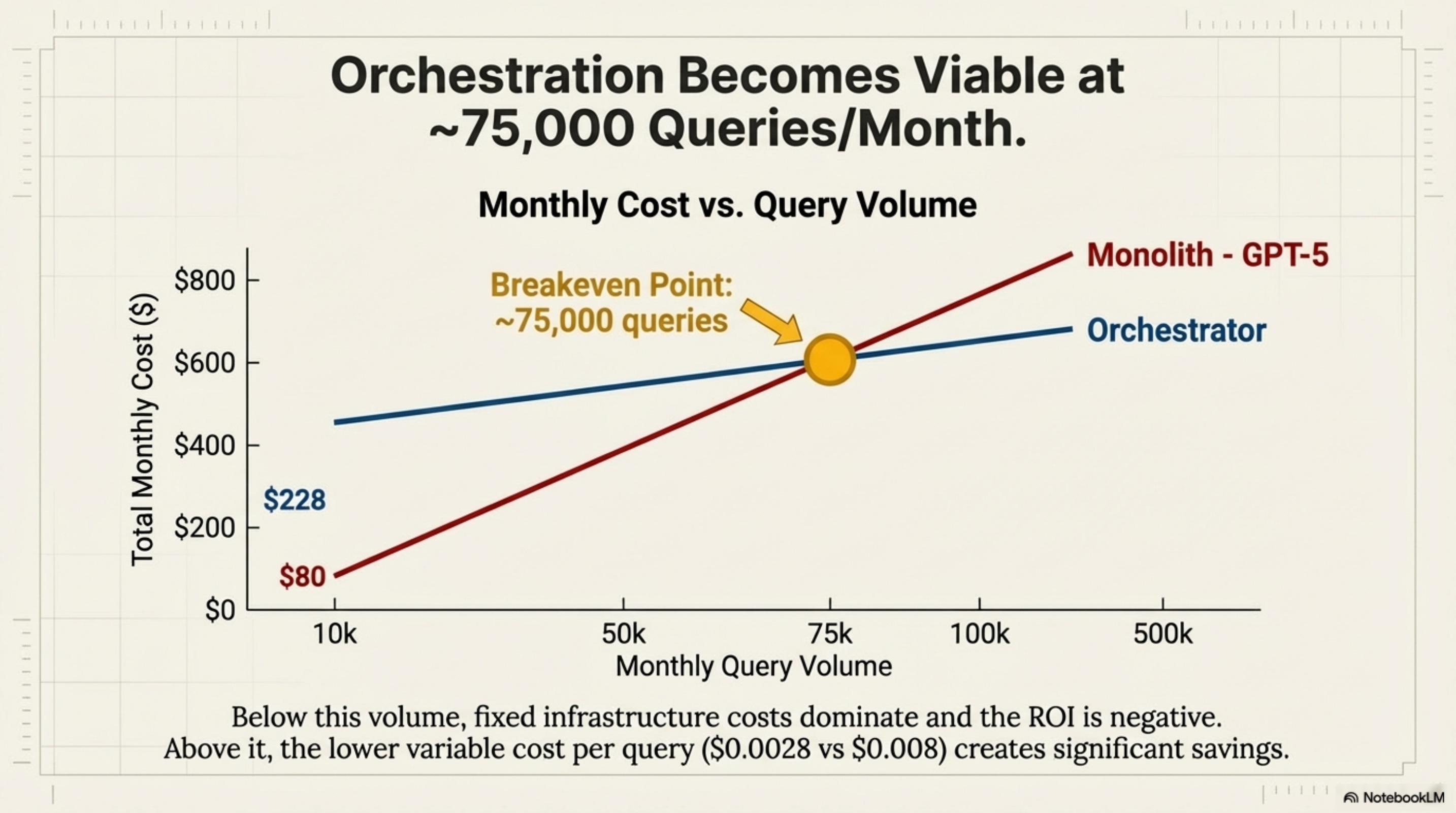 The Rule is that orchestration becomes viable at ~75,000 queries/month. Below that, fixed infrastructure costs dominate.