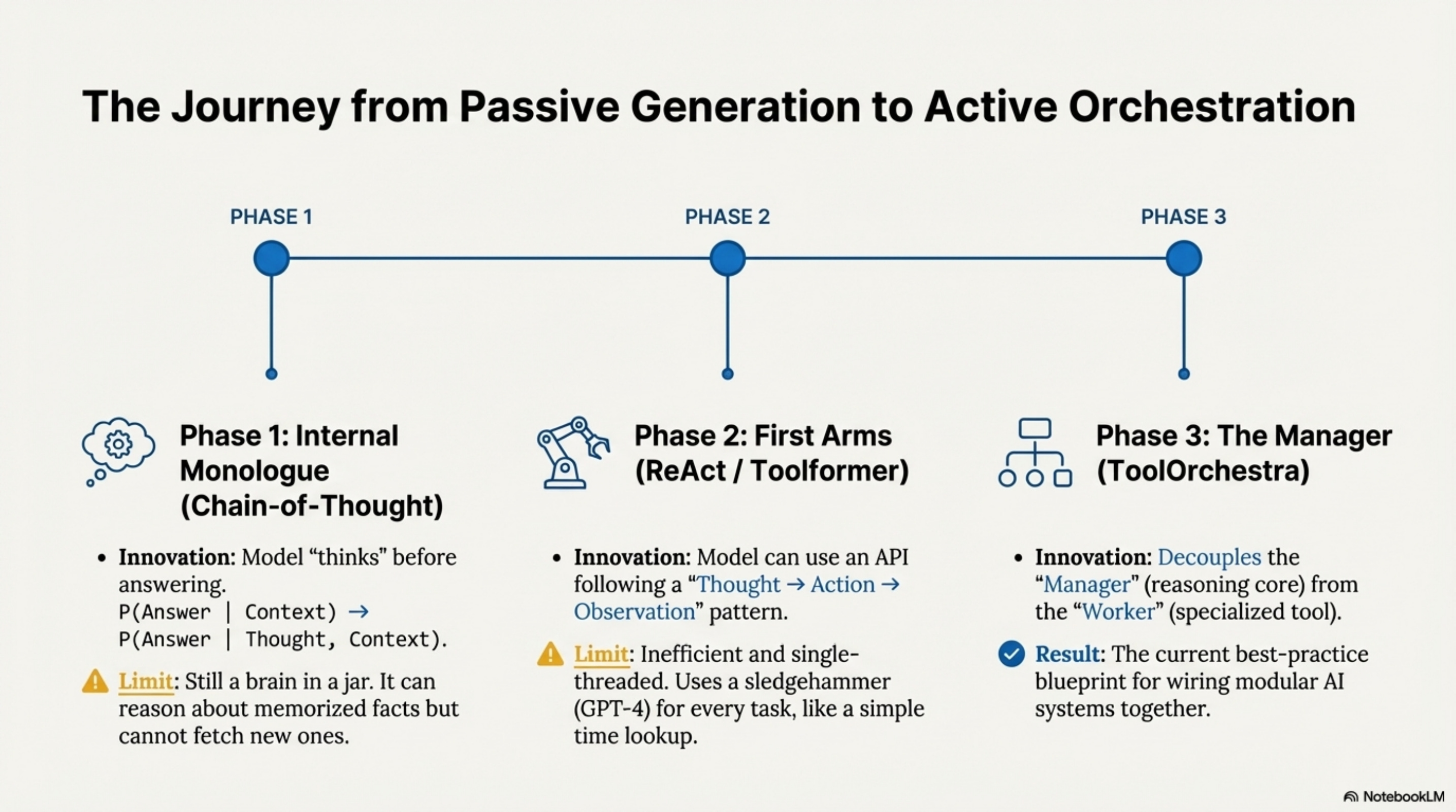 [!NOTE] System Auditor’s Log: To understand the future, we trace the lineage. ToolOrchestra is not a random mutation; it is the logical endpoint of a 5-year trend moving AI from “Passive Generation” to “Active Orchestration.” This Part merges the historical context with the theoretical “Compound AI” thesis to explain why the industry is shifting this way.