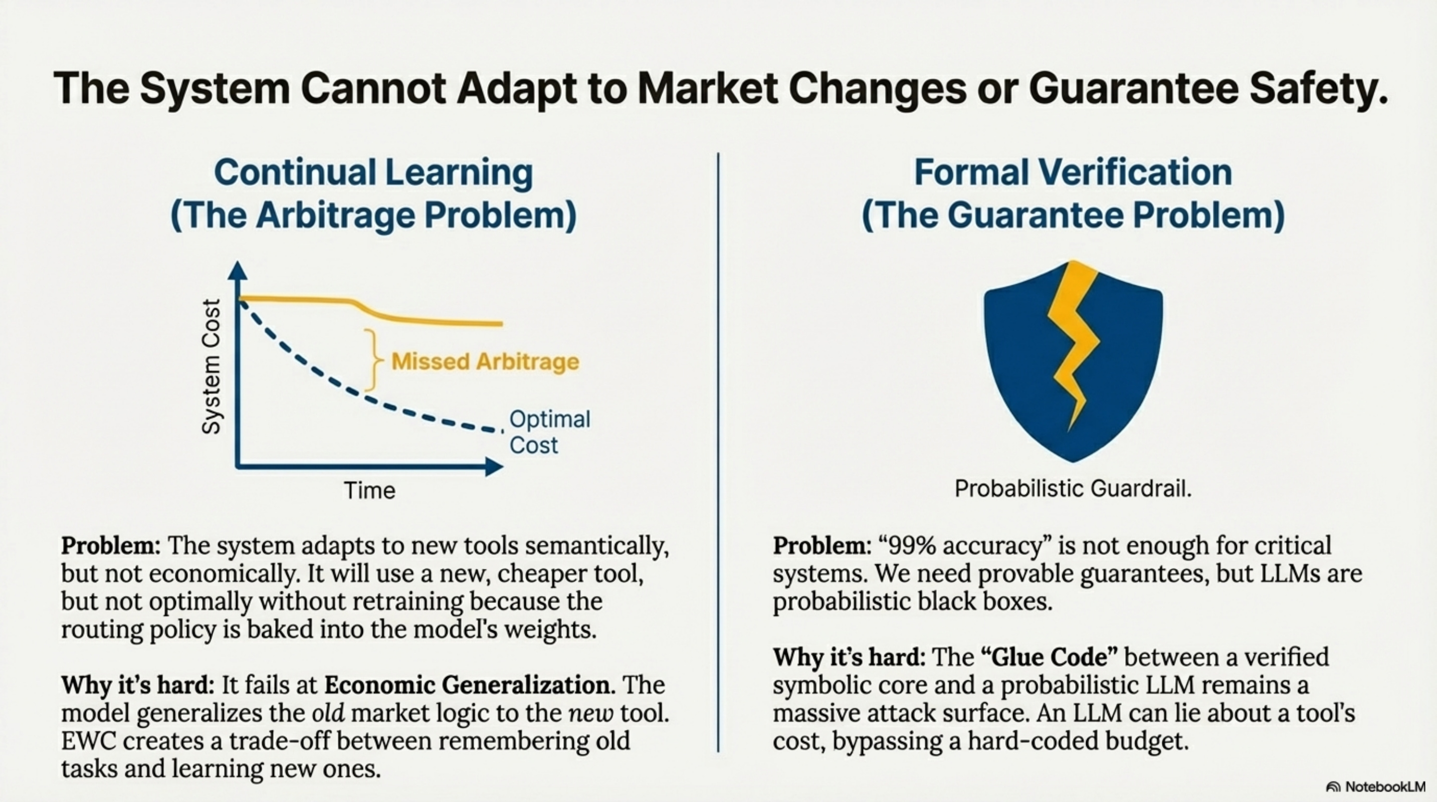 This is Semantic Generalization, and it works. However, Economic Generalization is fragile. The orchestrator learns market principles like “High-fidelity calculation is expensive.” If the market shifts and a new tool is both cheap and cheap, the learned heuristic fails. The model generalizes the old market logic to the new tool, resulting in missed arbitrage. This requires In-context adaptation via retrieval-augmented routing rather than baking preferences into weights.