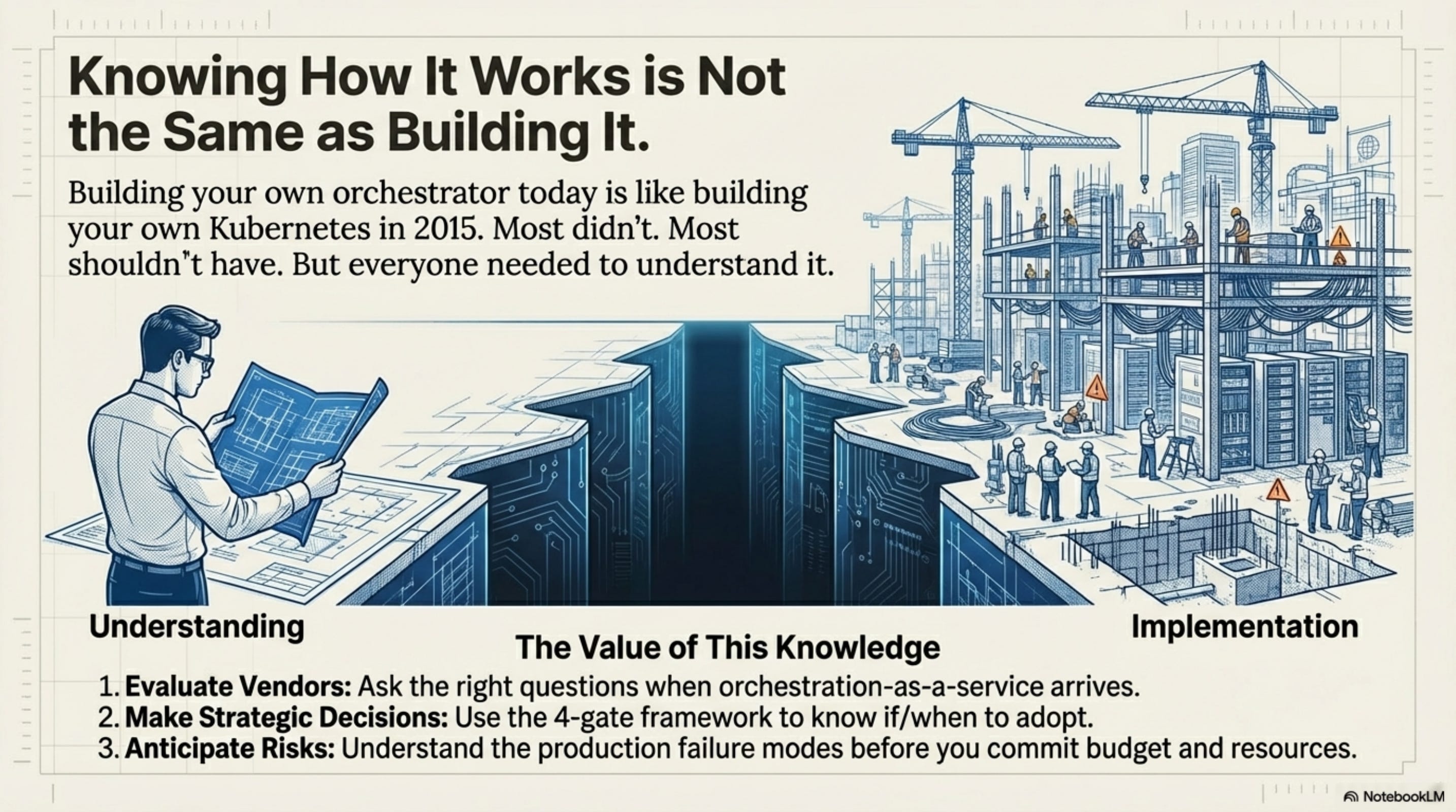 This series was optimized for understanding, not replication. If you have the resources (16 H100s, expert team), you now have the conceptual foundation. If you don’t, you have the knowledge to evaluate vendors and a decision framework to know when to buy. Most organizations will consume orchestration as a managed service rather than building it themselves. Understanding the paradigm is more valuable than training your own orchestrator.