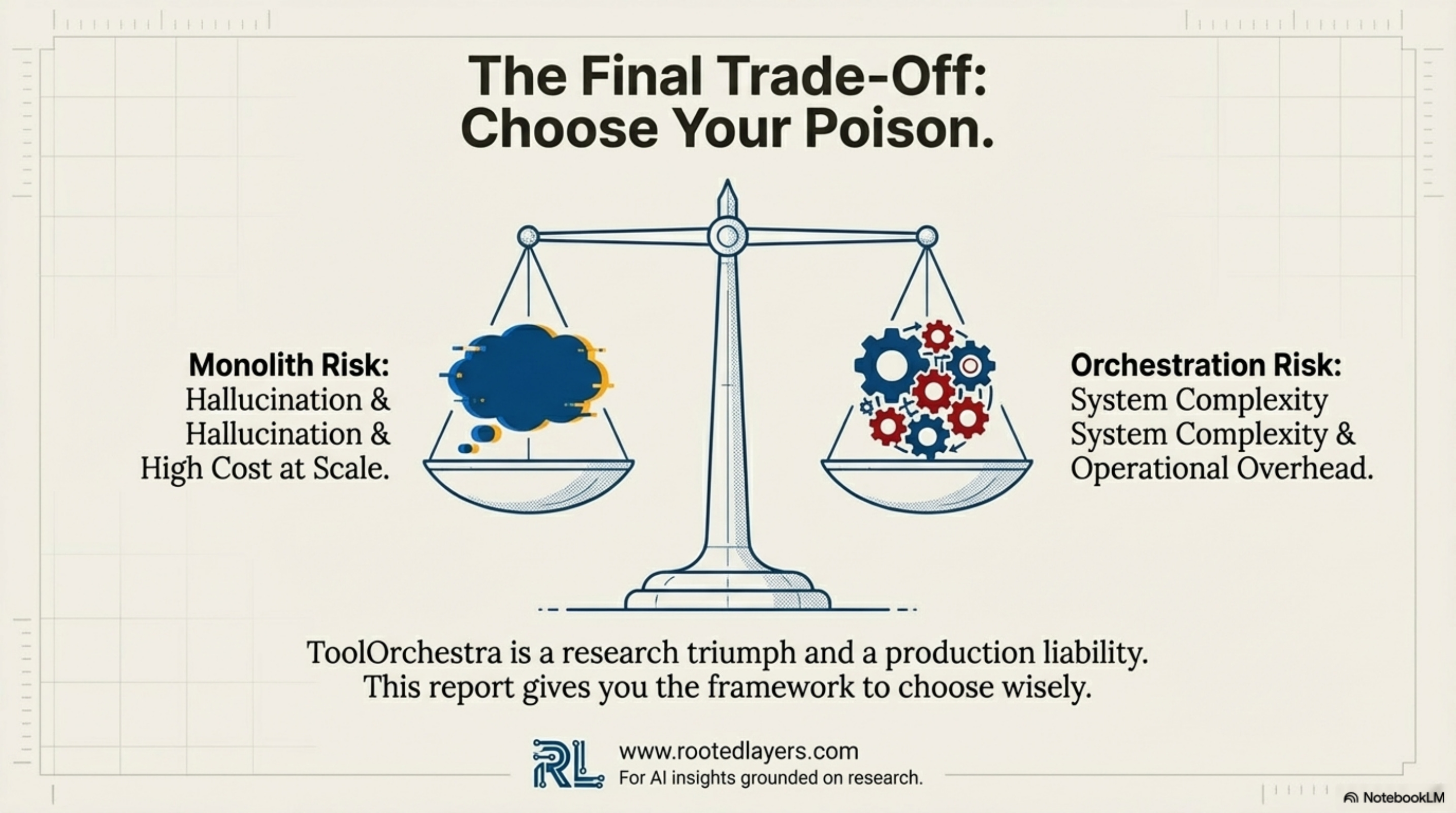 ToolOrchestra is a triumph of research. It proves we can teach models to adhere to a budget. But for the production engineer, it is a bundle of new liabilities. It trades “Hallucination Risk” (Monolith) for “System Complexity Risk” (Compound). Choose your poison carefully.